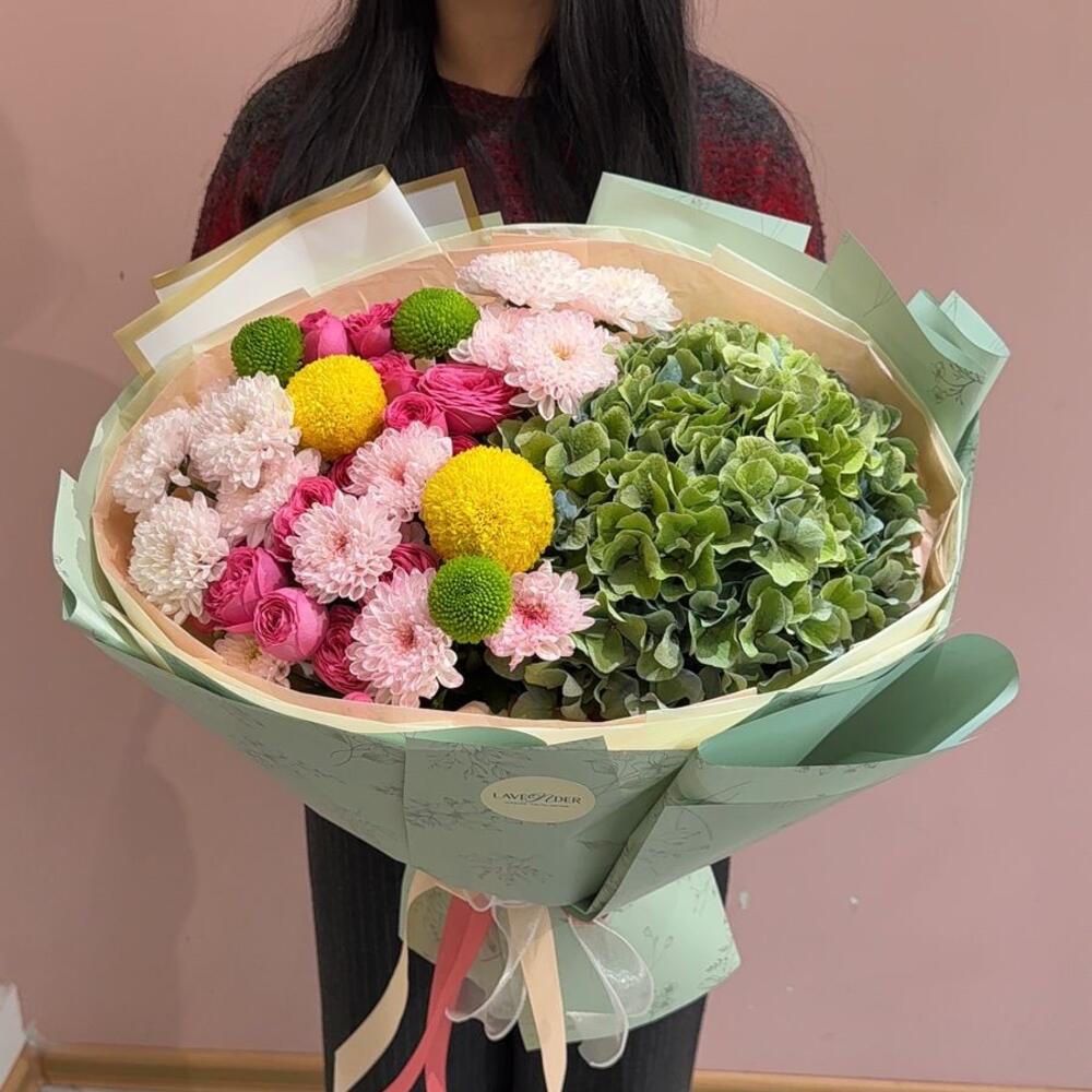 Hydrangea - 1 pcs Chrysanthemum bush - 3 pcs Chrysanthemum one - headed - 5 pcs Peony - shaped bush rose - 3 pcs
