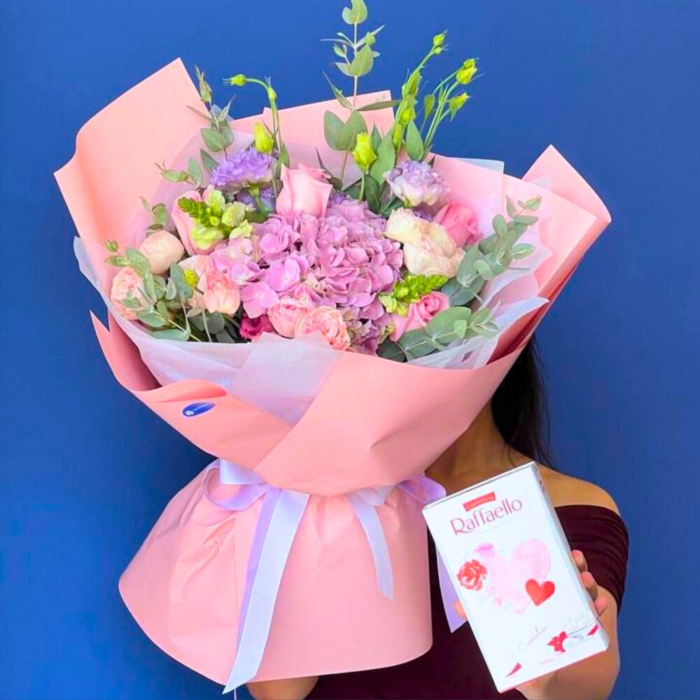 Hydrangea - 1 pcs Lisianthus - 2 pcs Eucalyptus - 3 pcs Rose - 5 pcs Bush rose - 2 pcs Packaging - 1 pcs Chocolate - 1 pcs