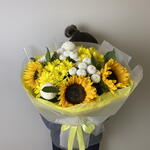 «Лучший День» — это солнечный, тёплый и жизнерадостный букет, созданный, чтобы дарить улыбки. В композиции сочетаются яркие подсолнухи, нежные жёлтые хризантемы и изящные декоративные акценты в светлых тонах.