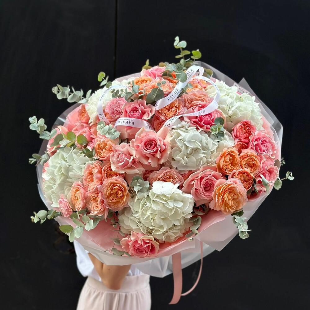 Postcard - 1 pcs Dutch rose 60 cm - 11 pcs hydrangea (Columbia) - 5 pcs carnation (Holland) - 3 pcs eucalyptus (holland) - 1 pcs peony-like spray rose (Kenya) - 9 pcs template for self-calculation - 4 pcs