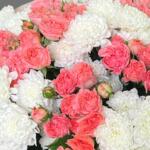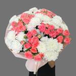 Белые хризантемы и кустовые розы в стильной упаковке — лёгкий, добрый букет с тёплой атмосферой. Подойдёт для мамы, подруги, учителя.