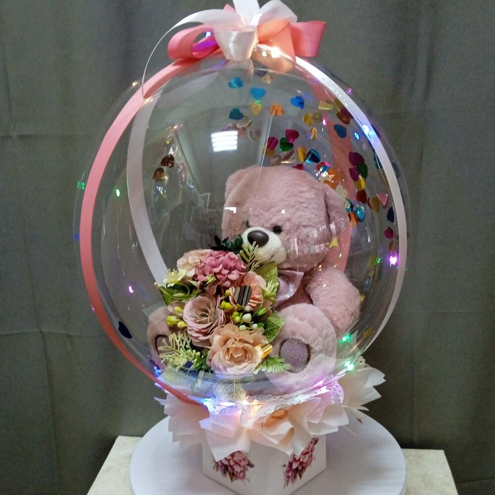Подарок-сюрприз с мишкой в шаре на коробке с подсветкой из светодиодной гирлянды на батарейках. На шар можно добавить индивидуальную надпись. Композиция с мягкой игрушкой в шаре прекрасный подарок для девушки, женщины, девочки, на день рождения, юбилей, 8 марта.