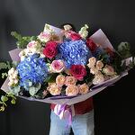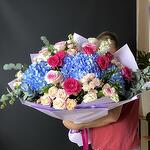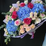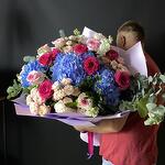 Hydrangea - 3 pcs Lisianthus - 4 pcs Matthiola - 5 pcs Pistache - 3 pcs Bush rose - 5 pcs Eucalyptus - 3 pcs Rose - 13 pcs Rose bush peony - shaped - 3 pcs Decoration - 1 pcs a postcard with your wishes - 1 pcs