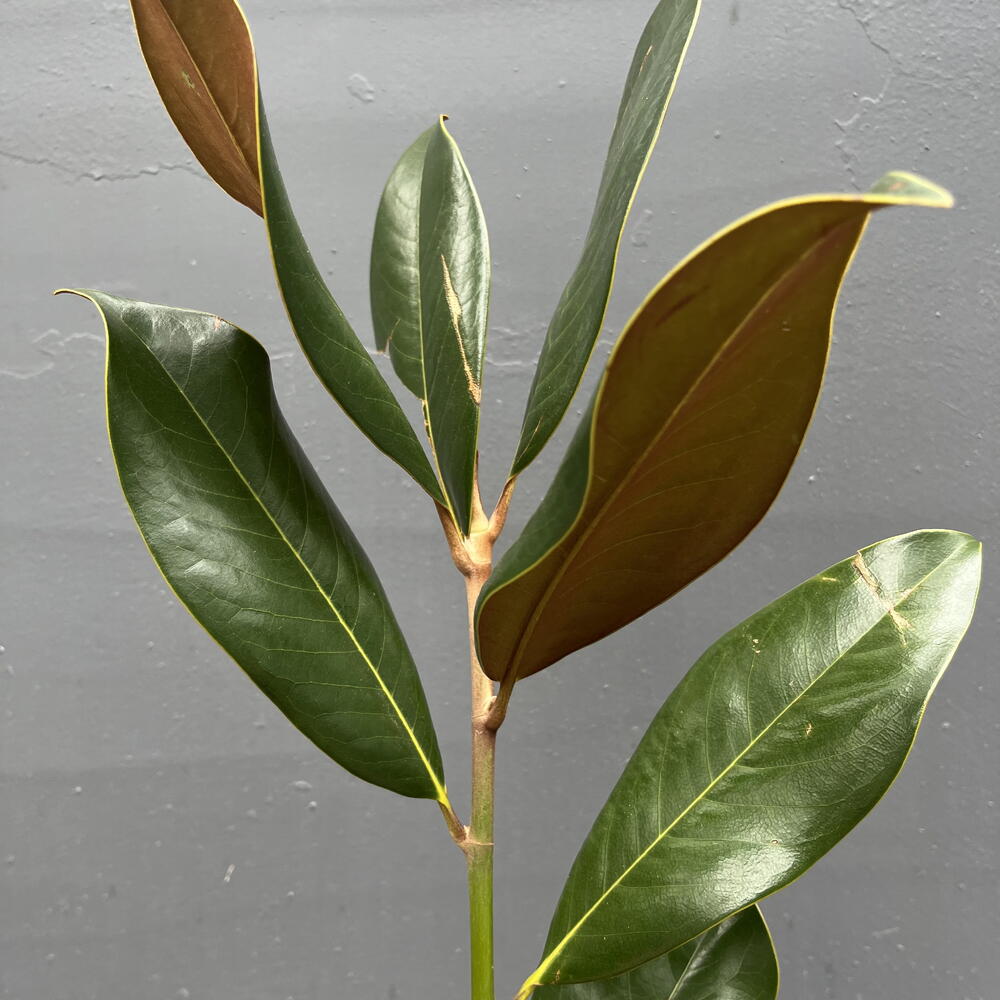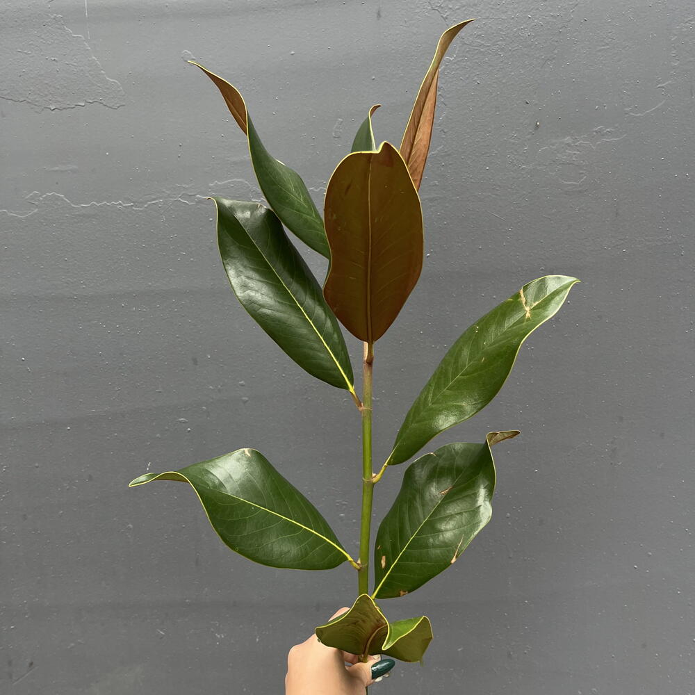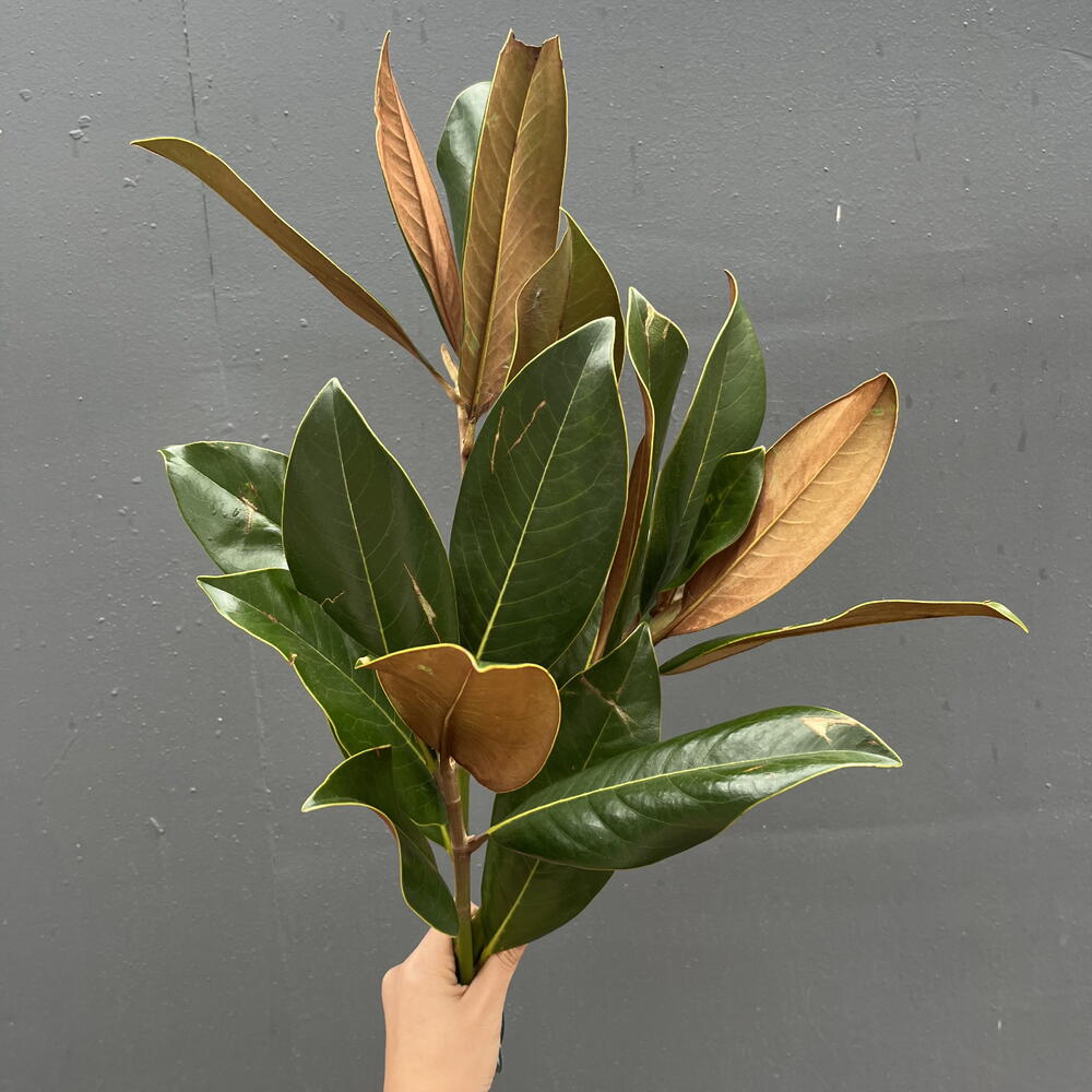 Декоративная ветка магнолии с плотными, кожистыми листьями глубокого зеленого оттенка. Характерная изнанка теплого коричневого цвета добавляет композициям выразительный контраст. Листва долго сохраняет свежий вид и форму, оставаясь устойчивой к увяданию