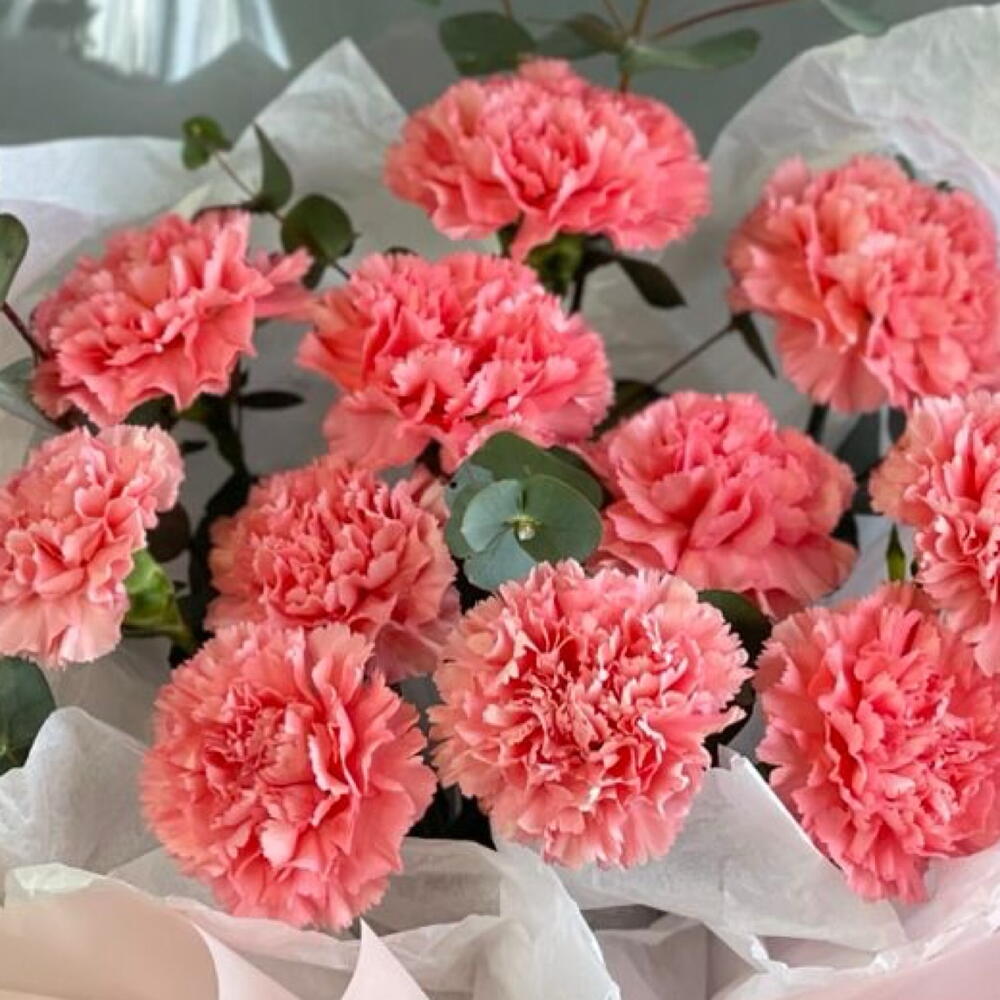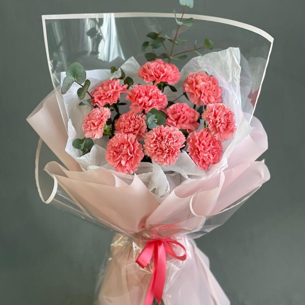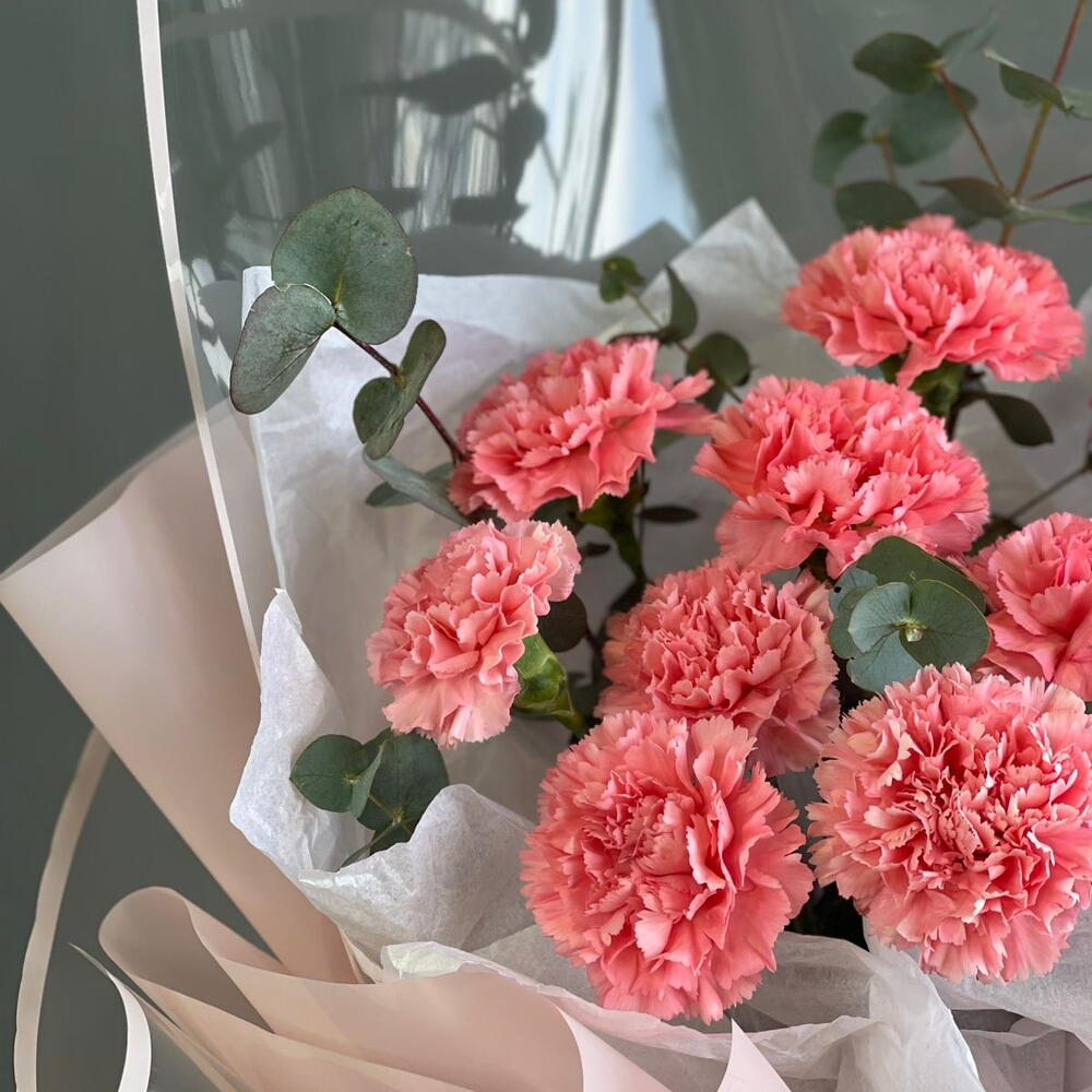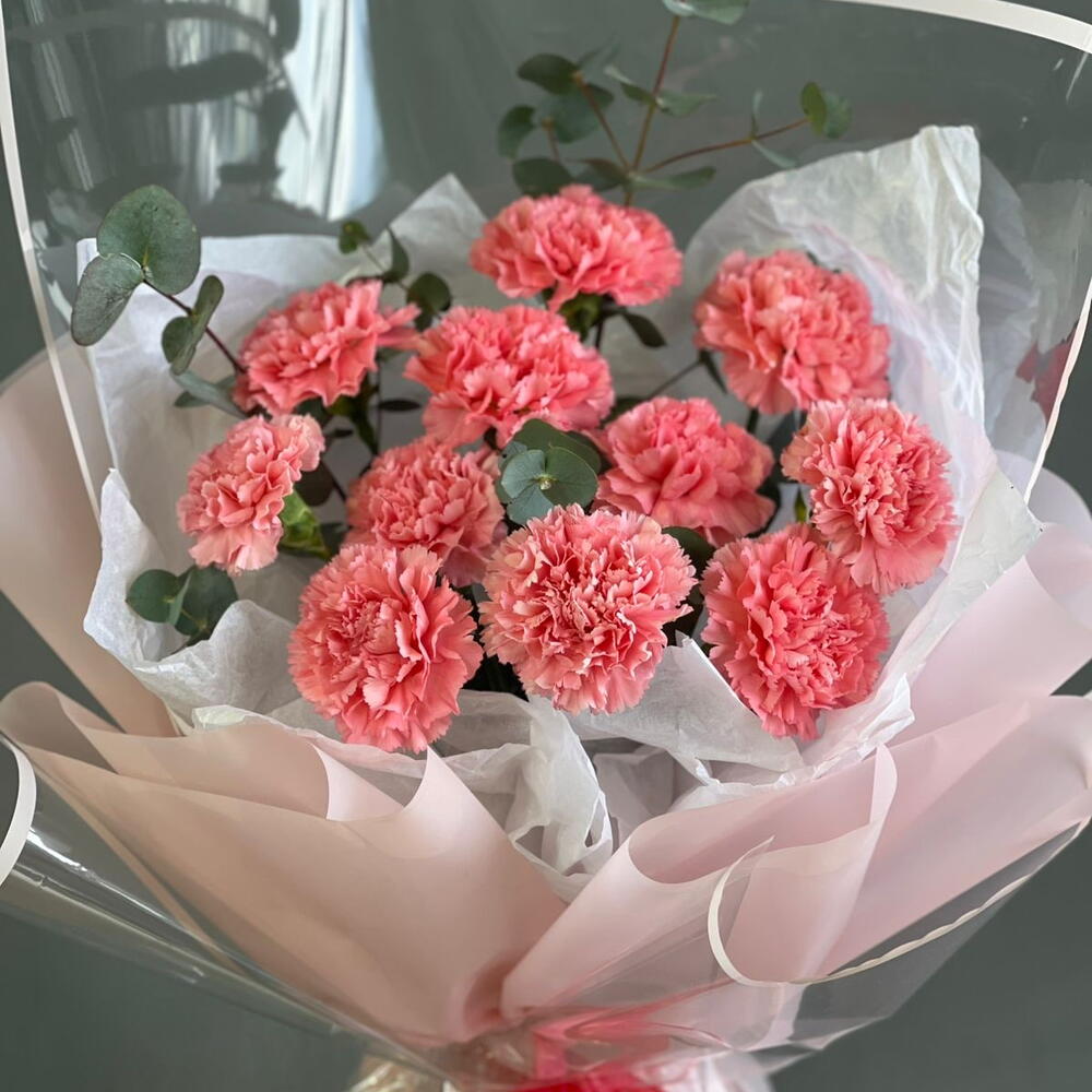 This bouquet is the embodiment of tenderness and touching beauty. The double petals of pink carnations, gathered in lush clusters, create the sensation of an ethereal cloud. Depending on the shade, the arrangement can convey a variety of moods. The carnations hold their shape perfectly, symbolizing motherhood, first love, and gratitude. This bouquet is both modest and elegant, conveying a feeling of warmth and spring freshness. It's a very long-lasting bouquet.