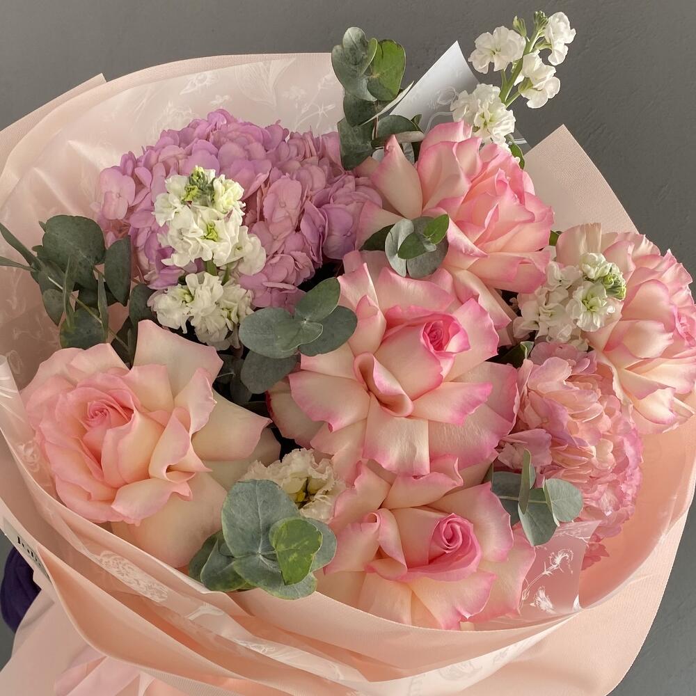 Hydrangea - 2 pcs French Rose - 5 pcs Eucalyptus Mix - 1 pcs mattiola bush - 3 pcs