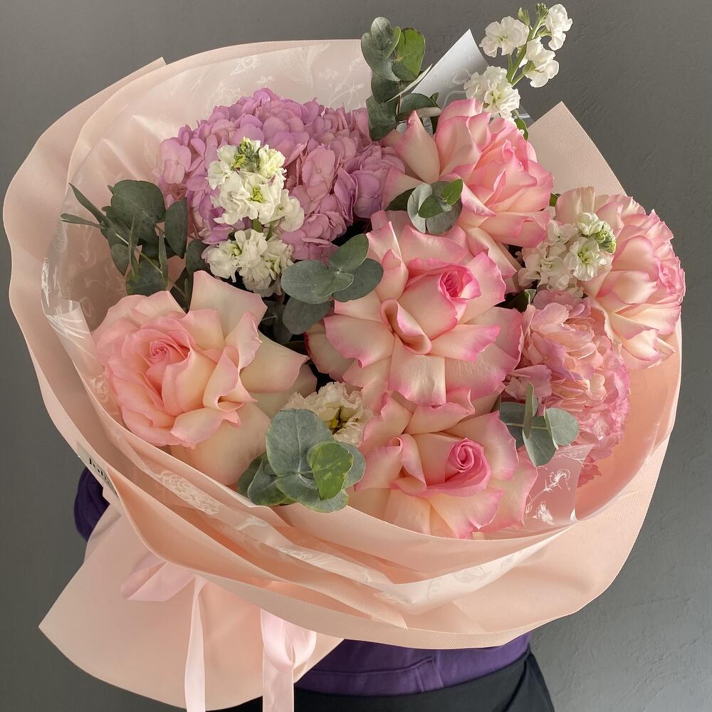 Букет из воздушных гортензий, французских роз, маттиолы с добавлением эвкалипта
