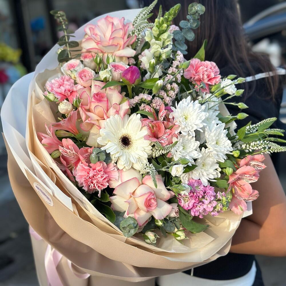 Alstroemeria - 5 pcs Eucalyptus - 7 pcs Carnation - 5 pcs Gerbera - 1 pcs French Rose - 3 pcs Snapdragon - 5 pcs chrysanthemums - 1 pcs