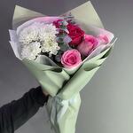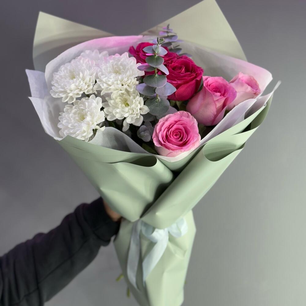 Chrysanthemum bush - 2 pcs Eucalyptus - 1 pcs rose varietal - 5 pcs