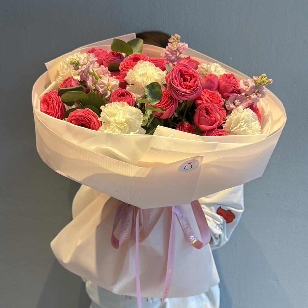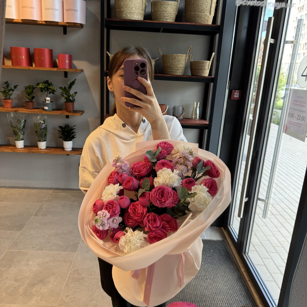 Matthiola - 4 pcs Eucalyptus - 4 pcs Chrysanthemum - 5 pcs bush roses - 8 pcs