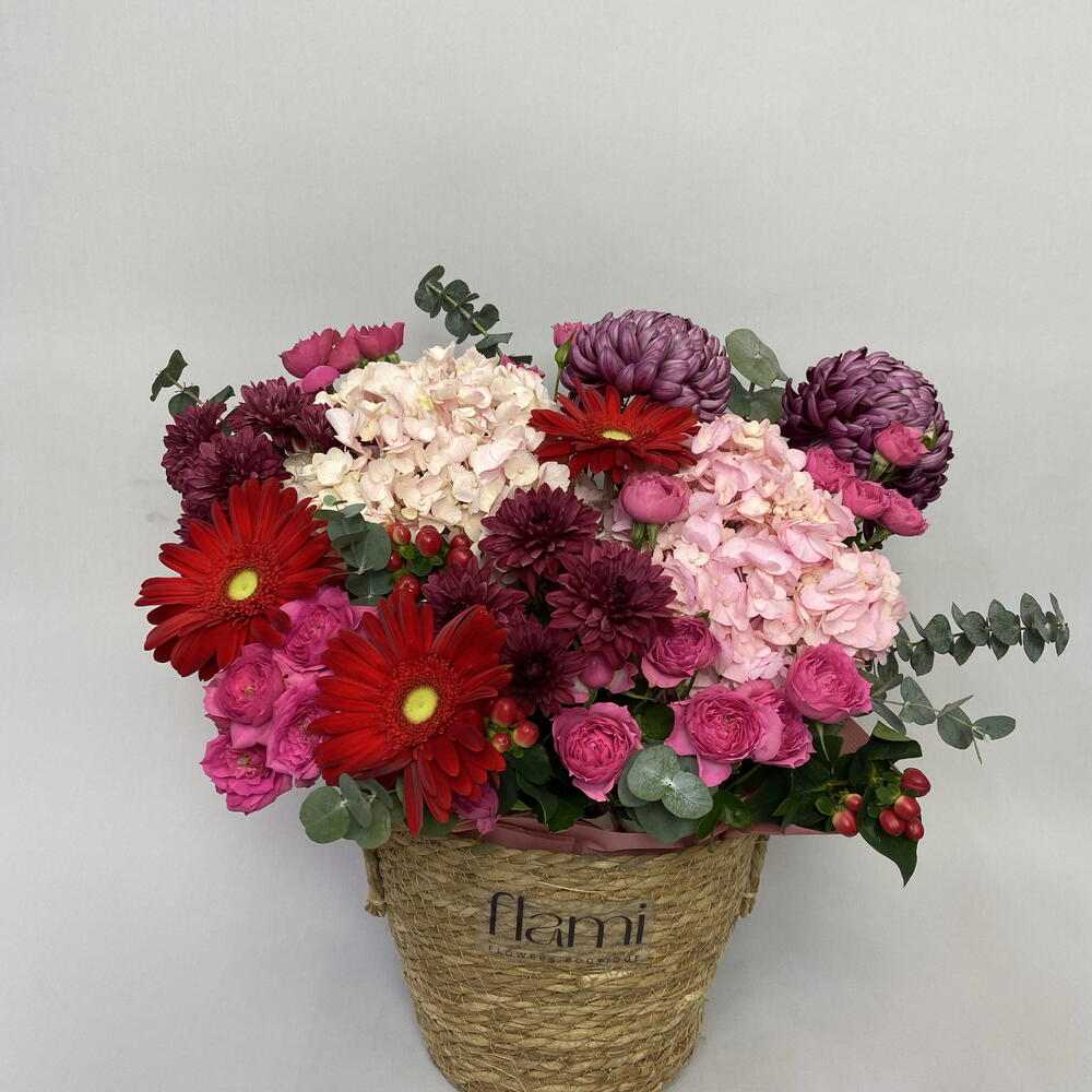 Hypericum - 3 pcs Hydrangea - 2 pcs Eucalyptus - 5 pcs Gerbera - 3 pcs Santini Mix - 2 pcs chrysanthemum curler - 2 pcs sofia kustovaya - 5 pcs
