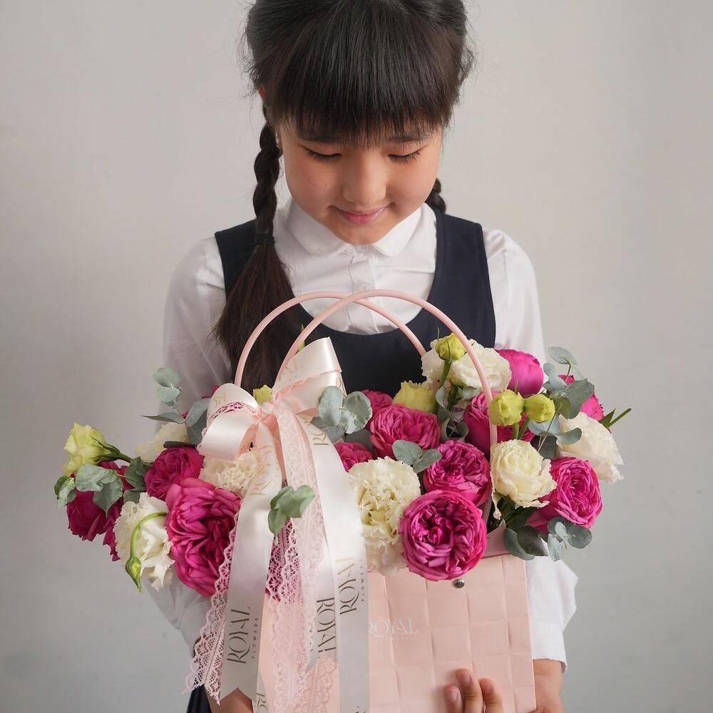 Очарование детства и лёгкость настроения заключены в этой яркой композиции. Насыщенные розовые и белоснежные оттенки в элегантной коробке с бантом создают настроение праздника и нежности. Композиция выполнена в форме сумочки — словно маленький цветочный аксессуар.