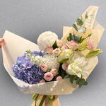 Hydrangea - 1 pcs Lisianthus - 1 pcs Lily - 1 pcs Chrysanthemum one - headed - 3 pcs Eucalyptus cinerea - 2 pcs Spray rose - 2 pcs