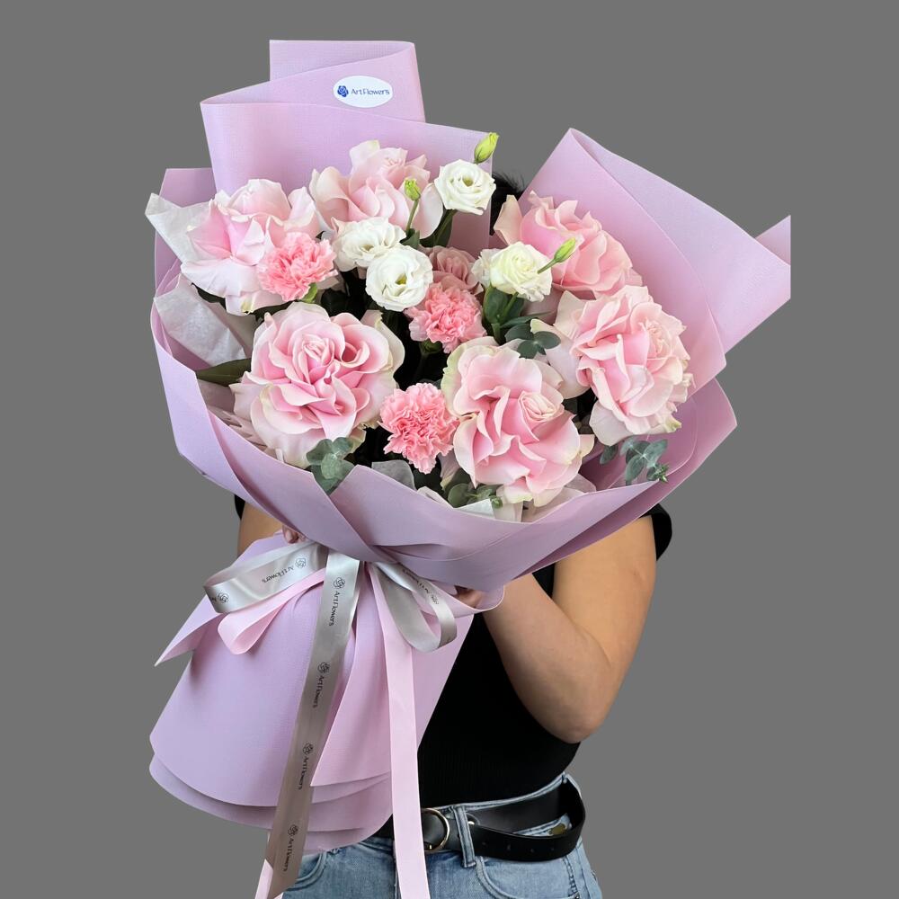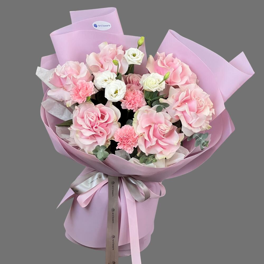 Eucalyptus - 1 pcs Carnation - 3 pcs roses - 7 pcs Lisianthus - 2 pcs aqua paper - 1 pcs