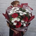 Этот изысканный монобукет, состоящий из 6 кустовых хризантем, дополнен свежим настроением трех притягательных гербер и красочной ноткой в виде трех веток кустового гиперикума красного цвета. Зеленые акценты трех веток фисташки замечательно подчеркивают естественную красоту букета. Все это изящно упаковано в стильную упаковку, что делает его идеальным для подарка!
