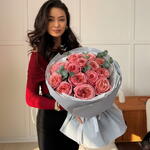 An elegant mono-bouquet consisting of 15 peony-style roses will evoke a sense of celebration and noble charm. The arrangement is complemented by a pair of eucalyptus sprigs that add freshness and a touch of exoticism. Such a bouquet will look great both on the bride's table and in interior settings, giving it a special touch of sophistication.