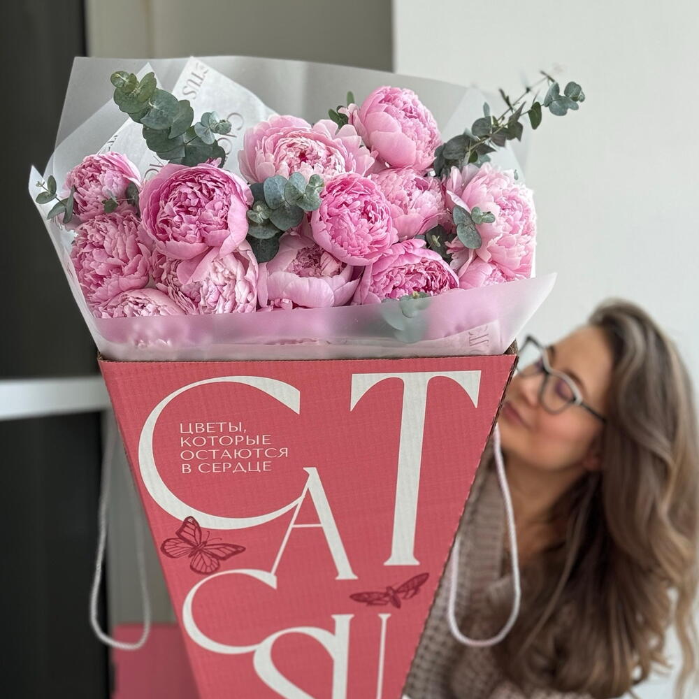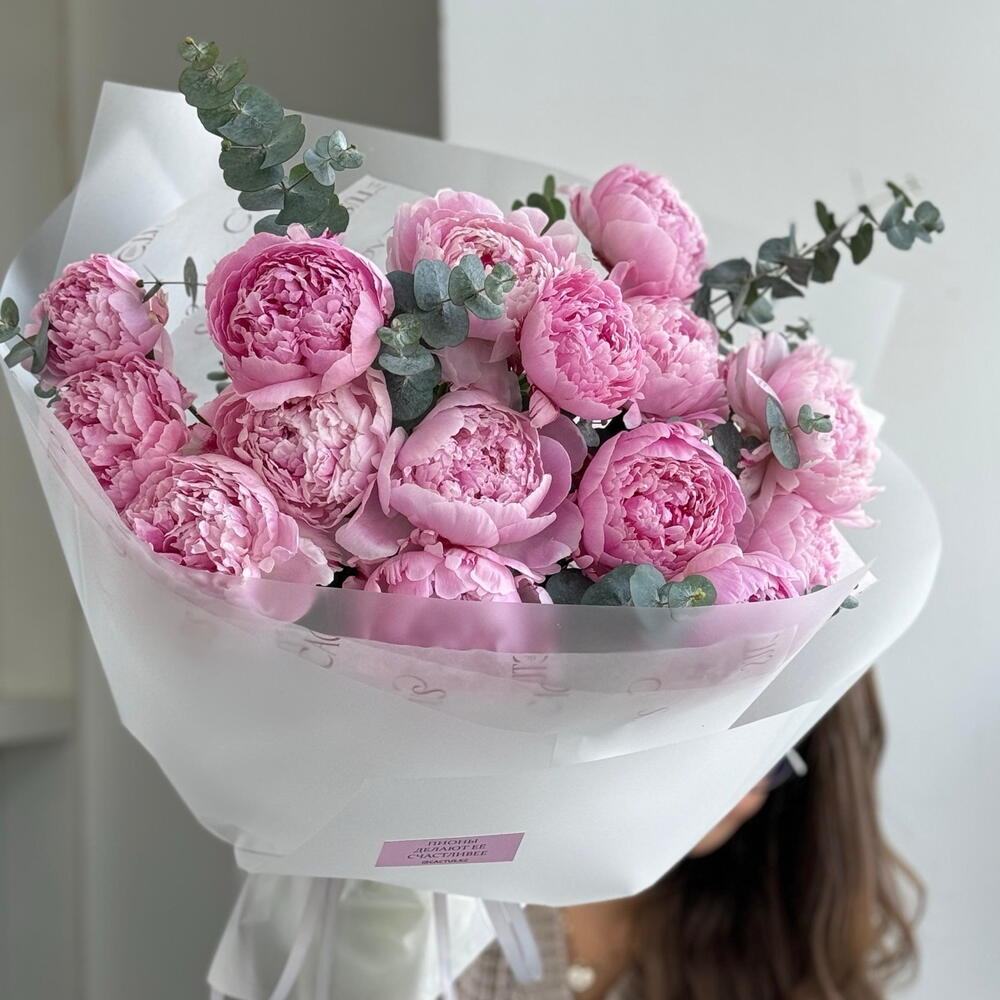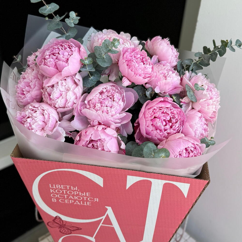 Peony - 15 pcs Eucalyptus - 1 pcs Designer packaging - 1 pcs