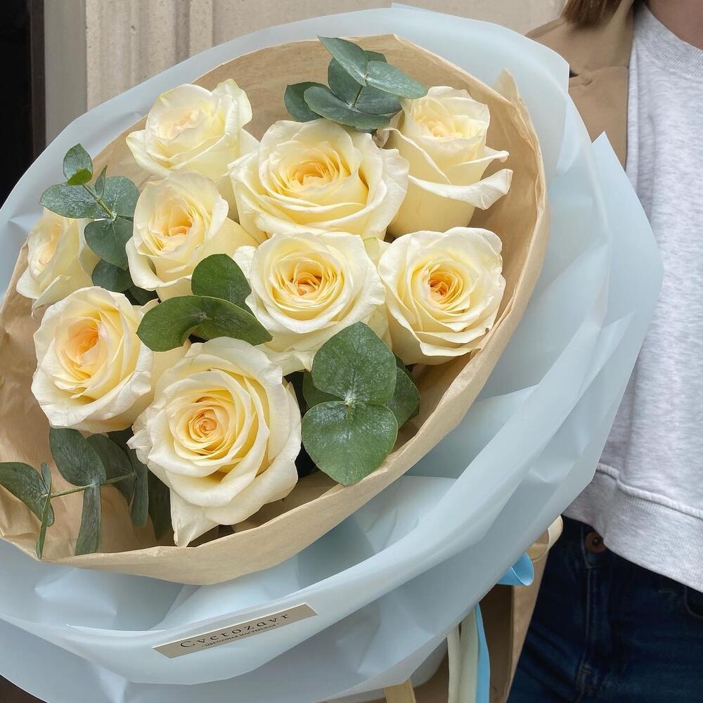 пионовидная роза “candlelight” с эвкалиптом - 9 pcs