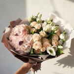 Нежный авторский букет, составленный из утончённых сезонных цветов. В его основе — кружевная гортензия и элегантные кустовые розы, дополненные воздушной эустомой и стильными сухоцветами. Дизайнерская упаковка и атласная лента подчеркивают изысканный характер композиции, создавая гармоничный образ, наполненный нежностью и красотой. Такой букет станет идеальным подарком для выражения любви, благодарности или поздравления с особым событием.