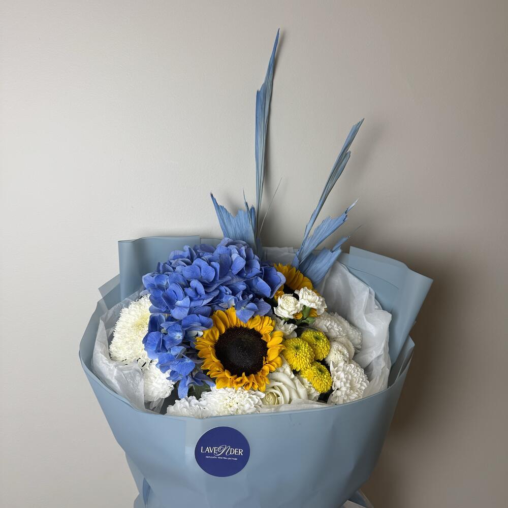 Яркий и солнечный букет в морских и золотых тонах. Уникальные синие элементы добавляют ему оригинальности и стиля. Букет, наполненный энергией, светом и глубиной