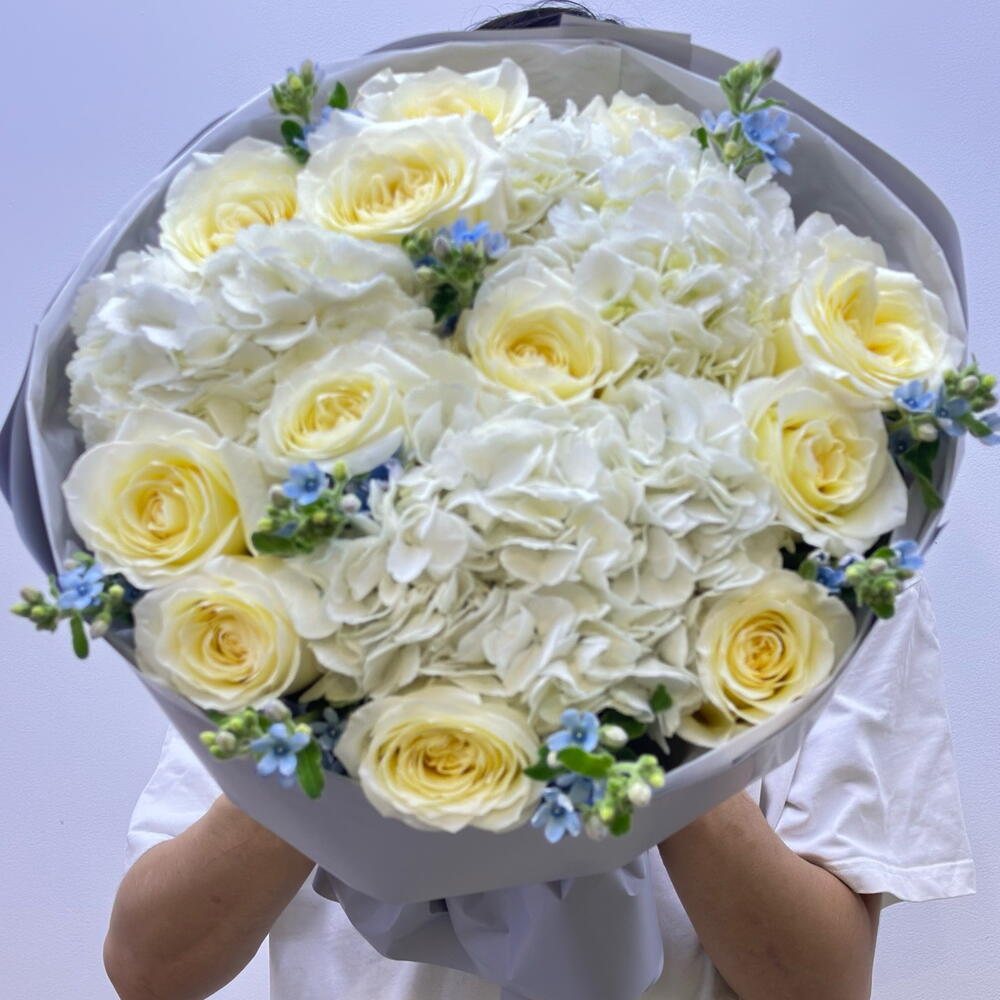 Hydrangea - 3 pcs tweed blue - 8 pcs пионы видные розы - 11 pcs