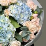 Свежий и стильный букет с голубыми гортензиями, нежными кустовыми розами и эвкалиптом. Легкий, воздушный и романтичный. Идеален для изысканных женщин.