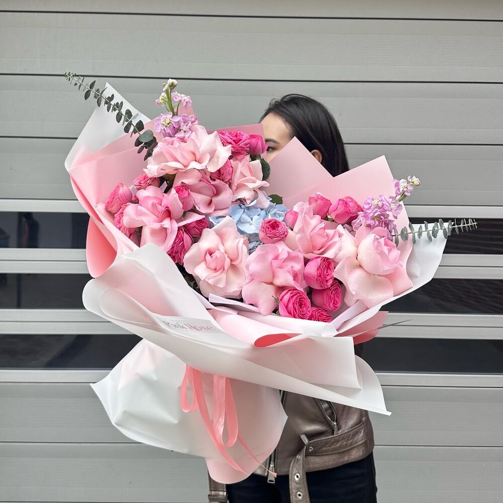 Hydrangea - 1 pcs Matthiola - 2 pcs Eucalyptus - 2 pcs Rose - 9 pcs rose Bush peony - 5 pcs