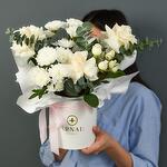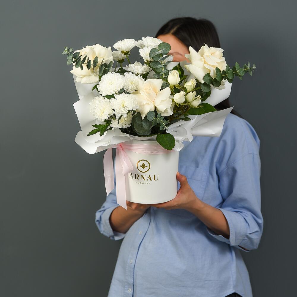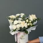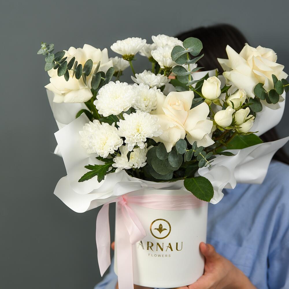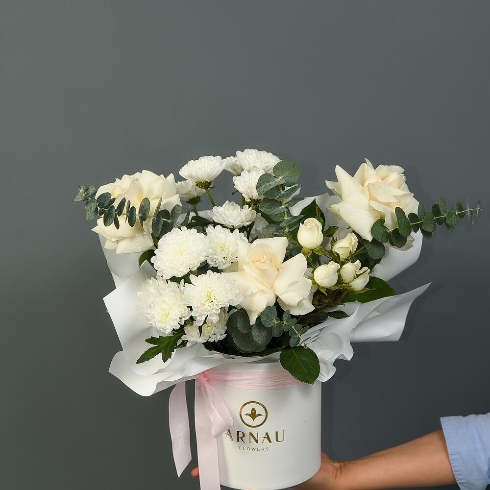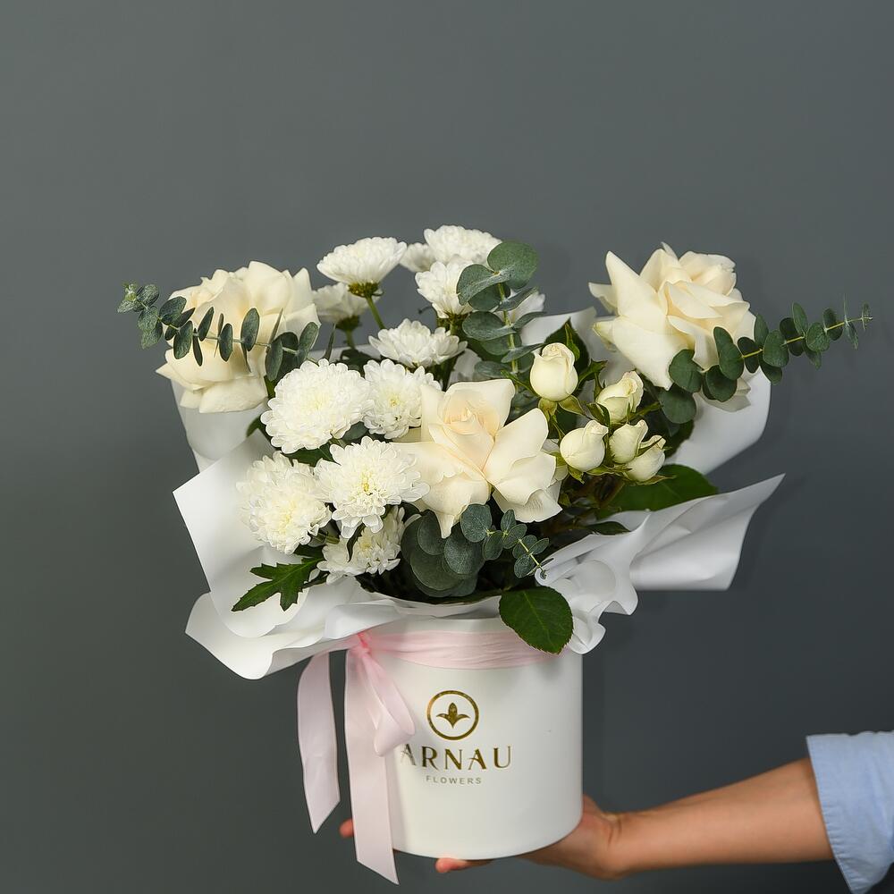 Eucalyptus - 1 pcs Rose - 3 pcs Bush rose - 1 pcs Chrysanthemum - 2 pcs