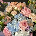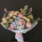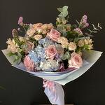 Alstroemeria - 1 pcs Hydrangea - 1 pcs Chrysanthemum bush - 1 pcs Eucalyptus - 1 pcs Design matte film - 1 pcs Spray rose - 2 pcs a postcard with your wishes - 1 pcs rose equa - 5 pcs