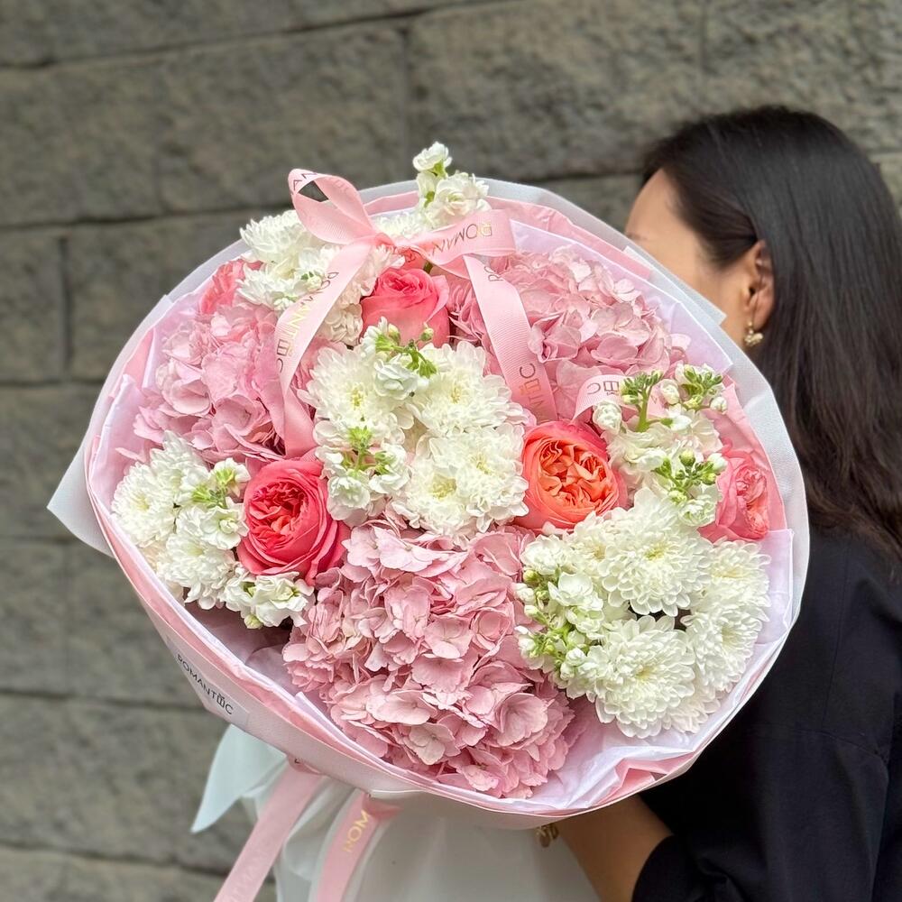 Hydrangea - 3 pcs Matthiola - 5 pcs Chrysanthemum bush - 4 pcs peony - shaped roses - 5 pcs