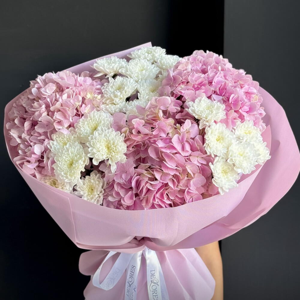 Этот авторский букет станет прекрасным выражением ваших чувств и настроения. Изысканная композиция из трех пышных гортензий и четырех кустовых хризантем обязательно привлечет внимание и подчеркнет ваш изысканный вкус. Идеально подходит как для праздничного события, так и для повседневного внесения ярких красок в жизнь.