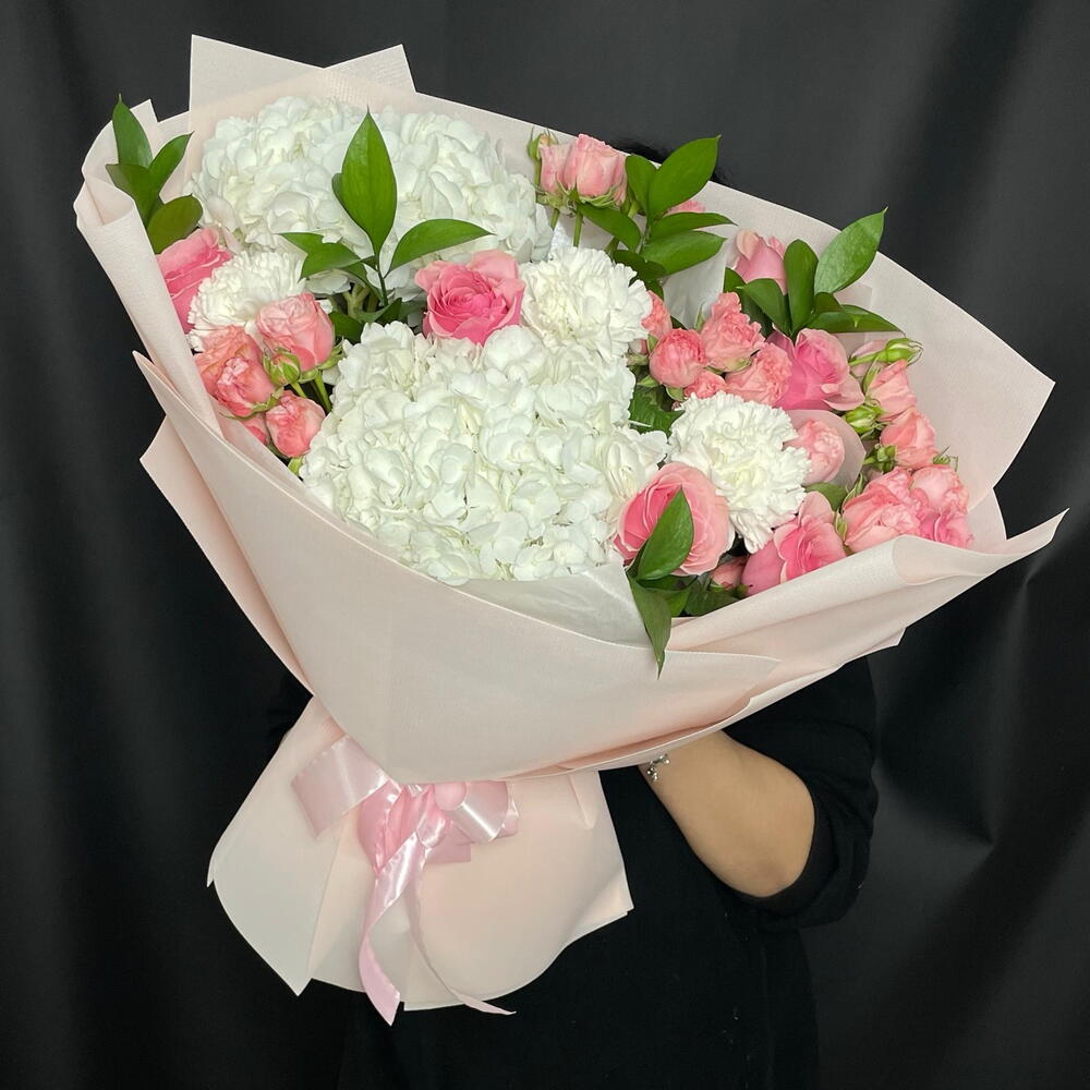 Hydrangea - 2 pcs The language is Russian. Here is the translation to English: "Ruscus" - 5 pcs Rose - 7 pcs Bush rose - 4 pcs Carnation - 3 pcs