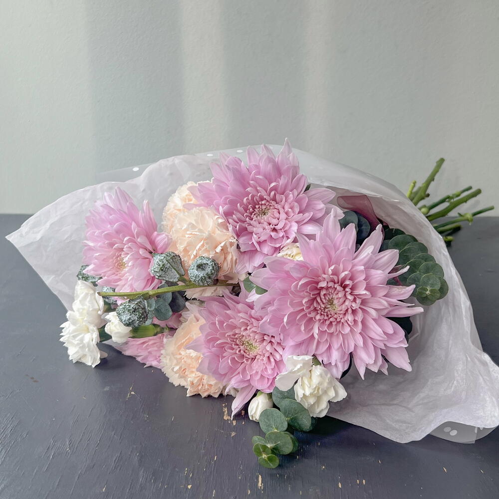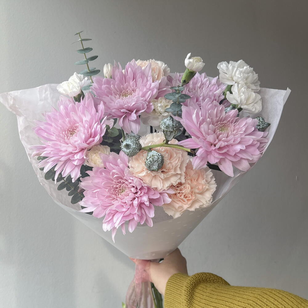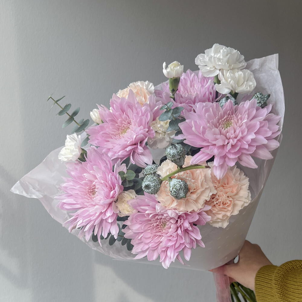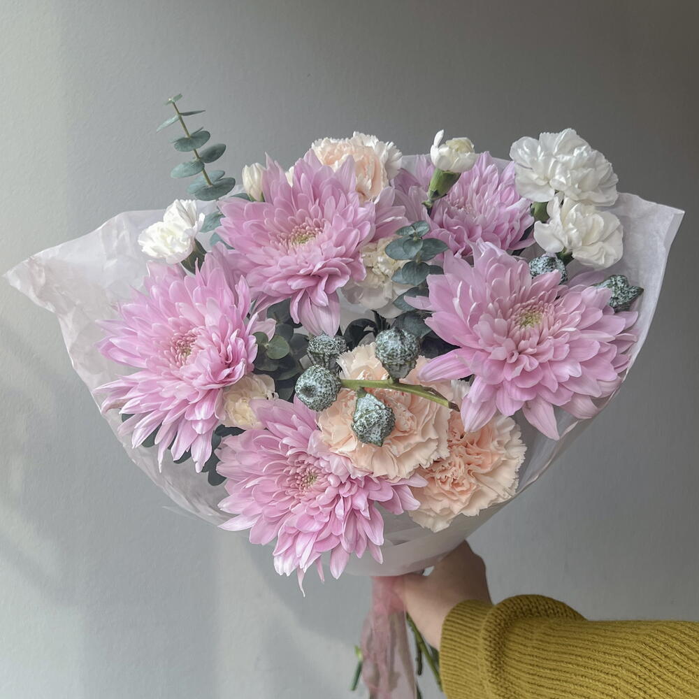 Chrysanthemum - 5 pcs Dianthus bush - 3 pcs Dianthus Brut - 3 pcs эвкалипт белые шишки - 1 pcs эвкалипт бейби - 3 pcs
