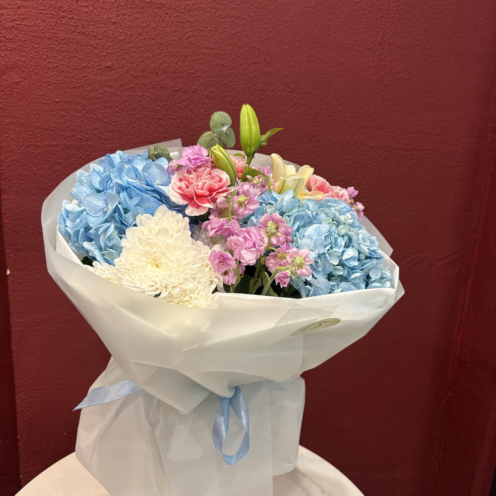 Hydrangea - 2 pcs Lily - 1 pcs Bush rose - 1 pcs Eucalyptus - 1 pcs Chrysanthemum - 2 pcs mattiola bush - 3 pcs