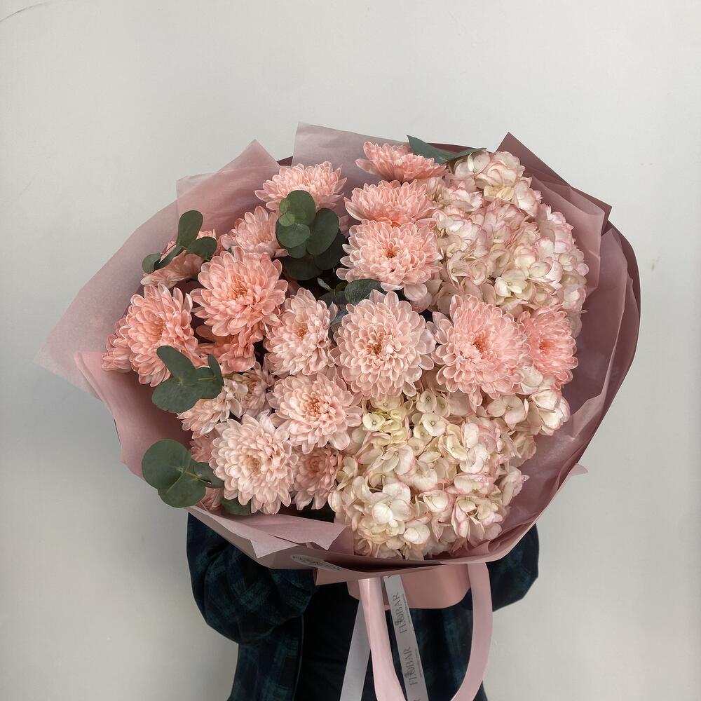 Hydrangea - 2 pcs Chrysanthemum bush - 4 pcs Eucalyptus - 1 pcs Packaging - 1 pcs