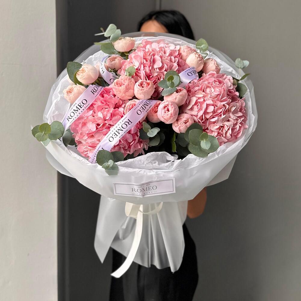 Нежный евробукет из гортензий и пионовидных кустовых роз