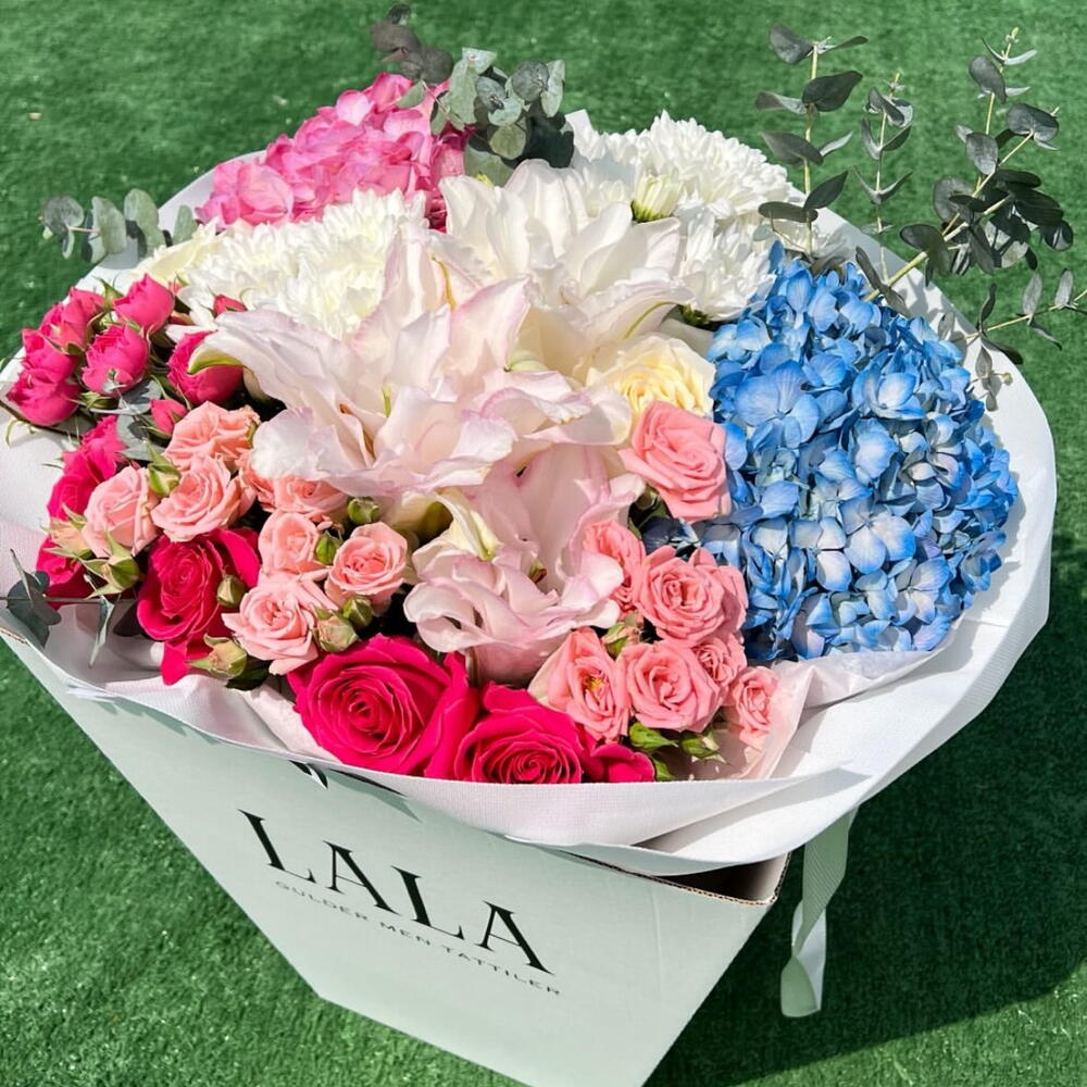 Hydrangea - 2 pcs Lily - 1 pcs Eucalyptus - 1 pcs Rose - 5 pcs Spray - 5 pcs carrying for flowers - 1 pcs