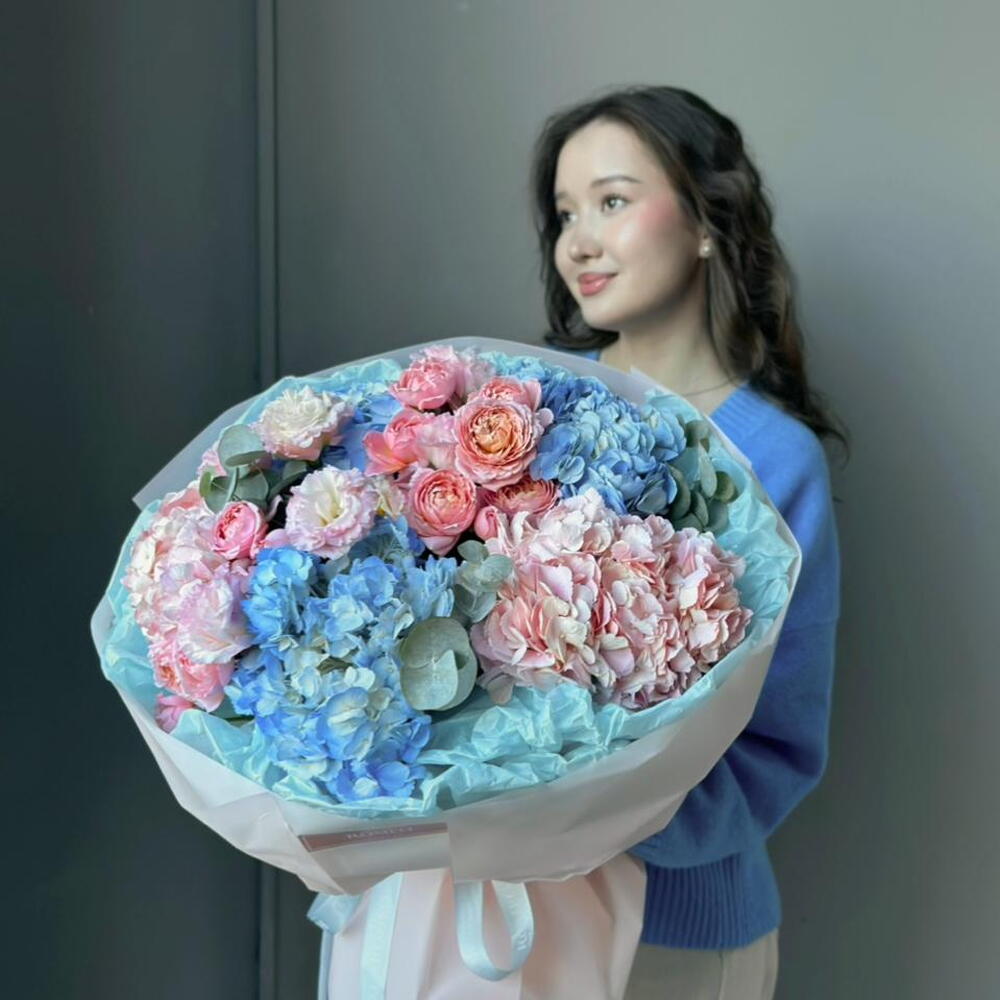 Нежный евробукет с гортензиями и кустовыми розами Джульетта