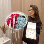 Luxurious bouquet with blue hydrangea and pink spray roses combined with a bento cake — the perfect gift for a girlfriend, wife or mom. The delicate floral arrangement looks stylish, high-end and very photogenic. Suitable for a birthday, March 8, February 14, an anniversary or a surprise with no occasion. Blue hydrangea symbolizes sincerity and harmony, while pink roses represent tenderness and care. The set includes a fresh bento cake — a trendy sweet gift. Order the bouquet with flower delivery to home or office — we will carefully pack the arrangement and deliver it on time. A great option if you are looking for "buy bouquet with cake", "flowers and sweets as a gift" or "delicate bouquet with hydrangea".