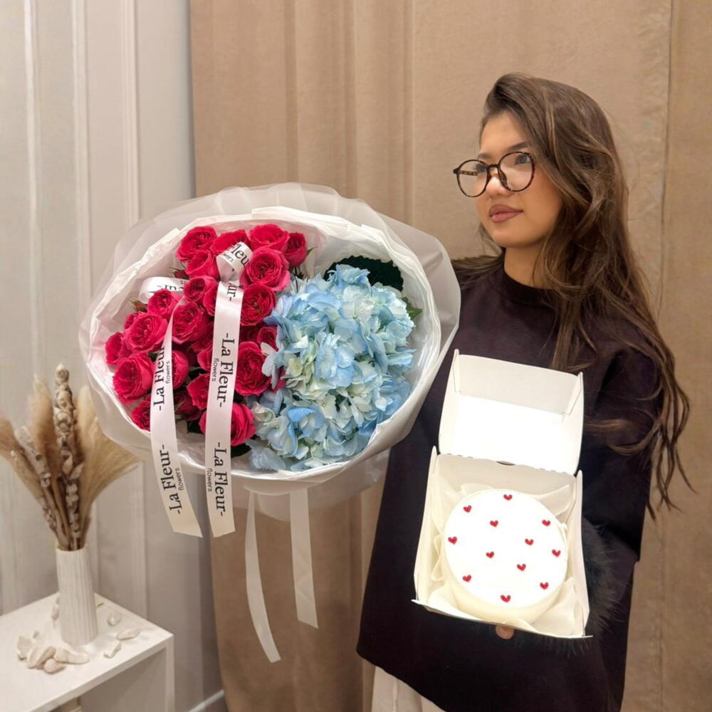 Luxurious bouquet with blue hydrangea and pink spray roses combined with a bento cake — the perfect gift for a girlfriend, wife or mom. The delicate floral arrangement looks stylish, high-end and very photogenic. Suitable for a birthday, March 8, February 14, an anniversary or a surprise with no occasion. Blue hydrangea symbolizes sincerity and harmony, while pink roses represent tenderness and care. The set includes a fresh bento cake — a trendy sweet gift. Order the bouquet with flower delivery to home or office — we will carefully pack the arrangement and deliver it on time. A great option if you are looking for "buy bouquet with cake", "flowers and sweets as a gift" or "delicate bouquet with hydrangea".