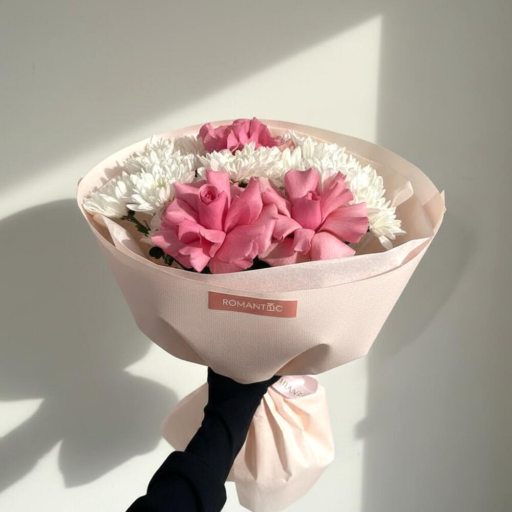 Представляем вашему вниманию авторский букет, состоящий из двух пышных кустовых хризантем и трех роскошных роз высотой 50 см каждая. Этот изысканный состав подарит массу удовольствия и радости его обладателю, сумеет выразить глубину ваших чувств и делает акцент на вашем превосходном вкусе. Идеальным дополнением к этой композиции станет теплый вечер, проведенный в комфортной обстановке. Создавайте незабываемые моменты с нашими авторскими букетами.