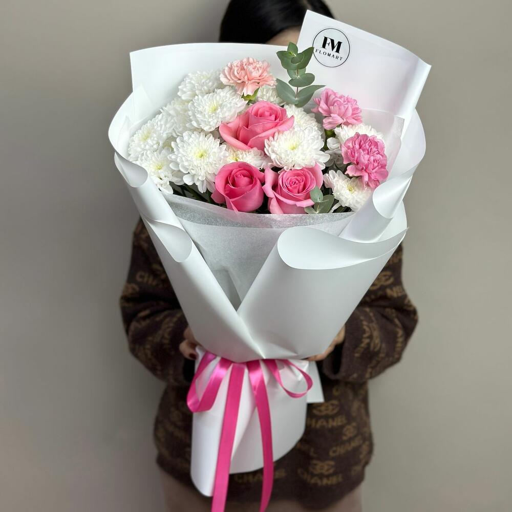 Eucalyptus - 1 pcs Carnation - 3 pcs chrysanthemums - 3 pcs roses - 3 pcs