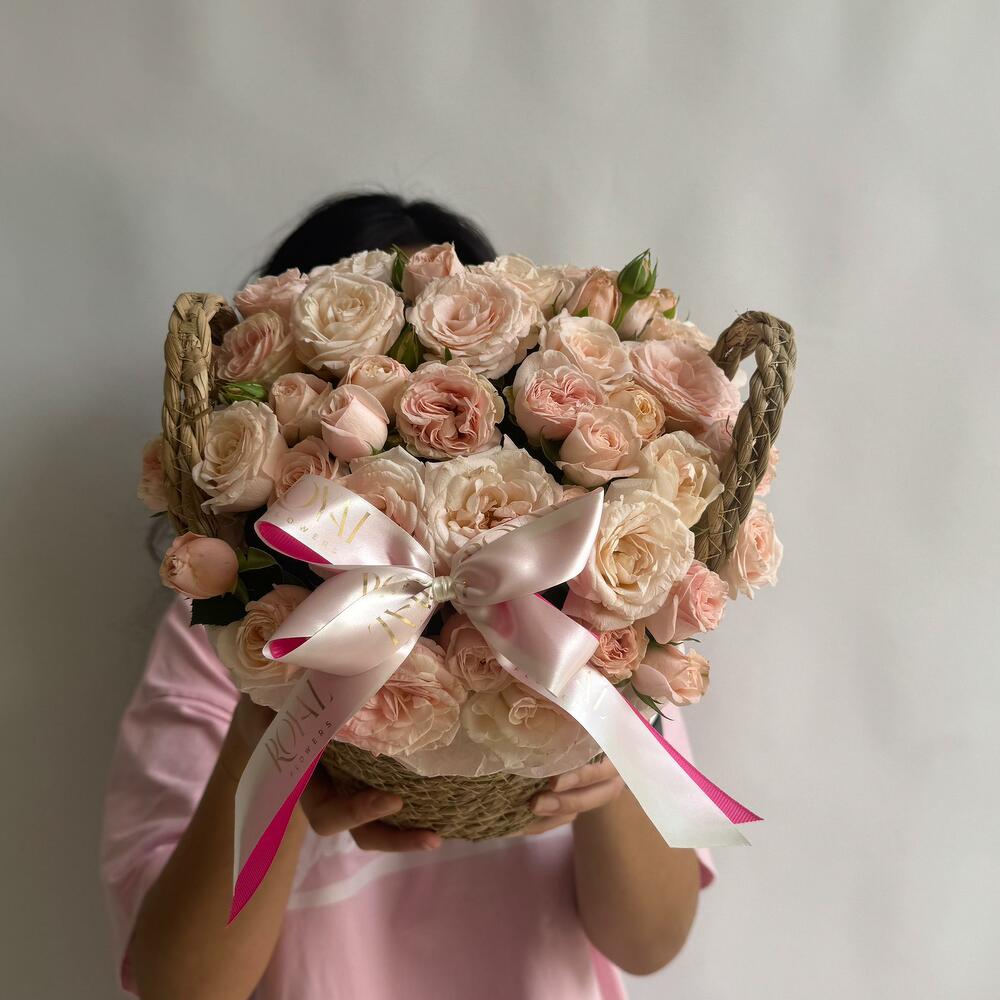 Элегантная композиция из нежно розовых роз в плетеной корзине. Идеальный подарок для самых теплых чувств.