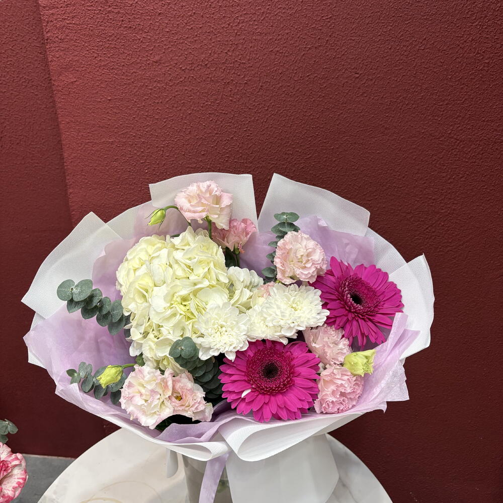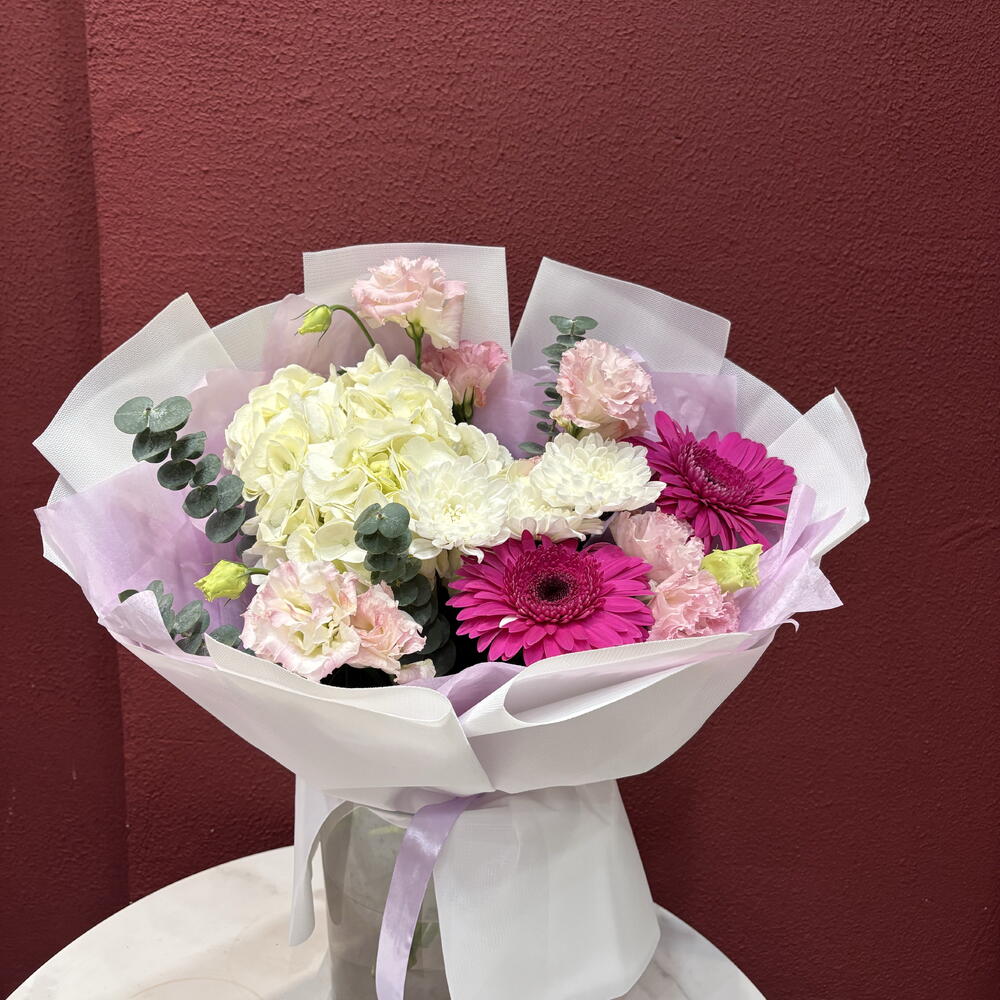 Hydrangea - 1 pcs Chrysanthemum bush - 1 pcs Eustoma - 4 pcs Gerbera - 2 pcs
