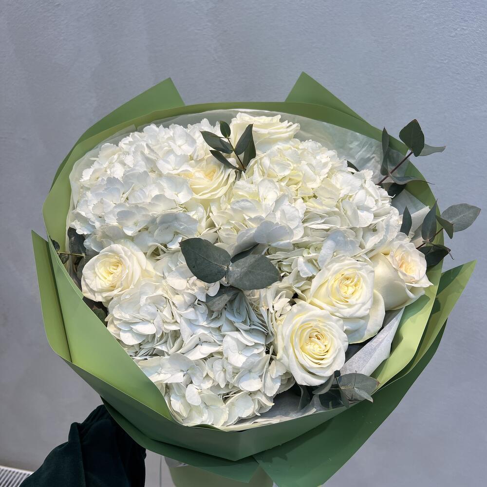 Hydrangea - 3 pcs Eucalyptus - 1 pcs роза кондилайт - 7 pcs