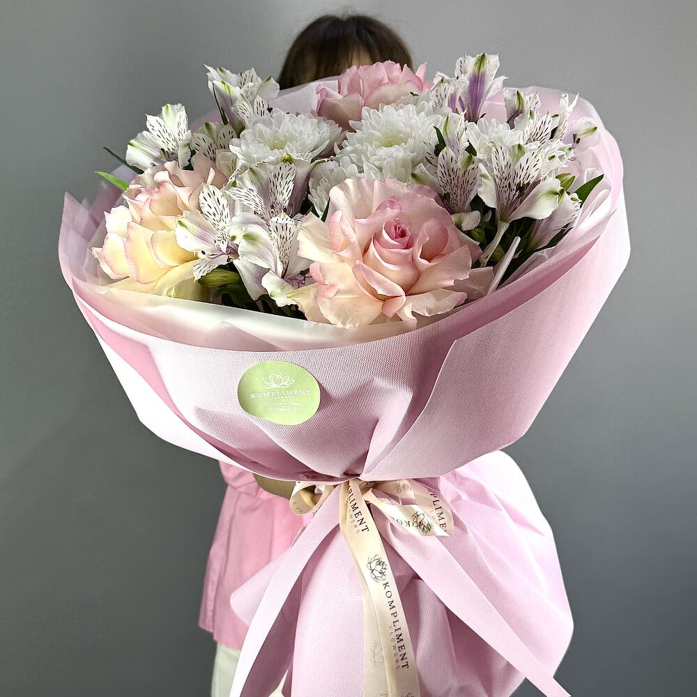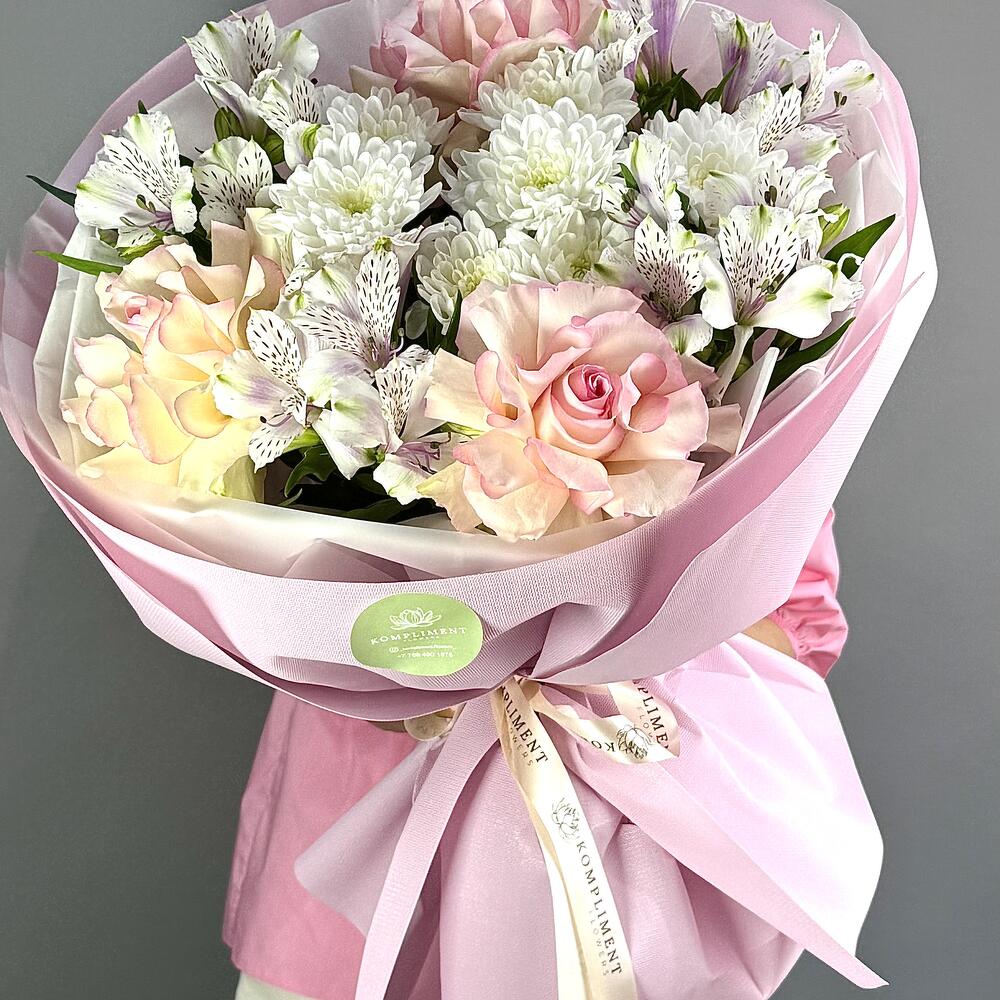 Нежно-розовый букет из розы, альстромерии и хризантемы — трогательное поздравление ко Дню матери Подарите маме моменты радости с утончённым букетом в нежно-розовых тонах. Роза — символ любви, альстромерия — знак заботы, а хризантема — благодарности. В этом букете всё, что хочется сказать самому близкому человеку. Свежесть, стиль и тёплые эмоции в каждом лепестке. Оформите заказ с доставкой ко Дню матери и подарите своей маме цветочную сказку!