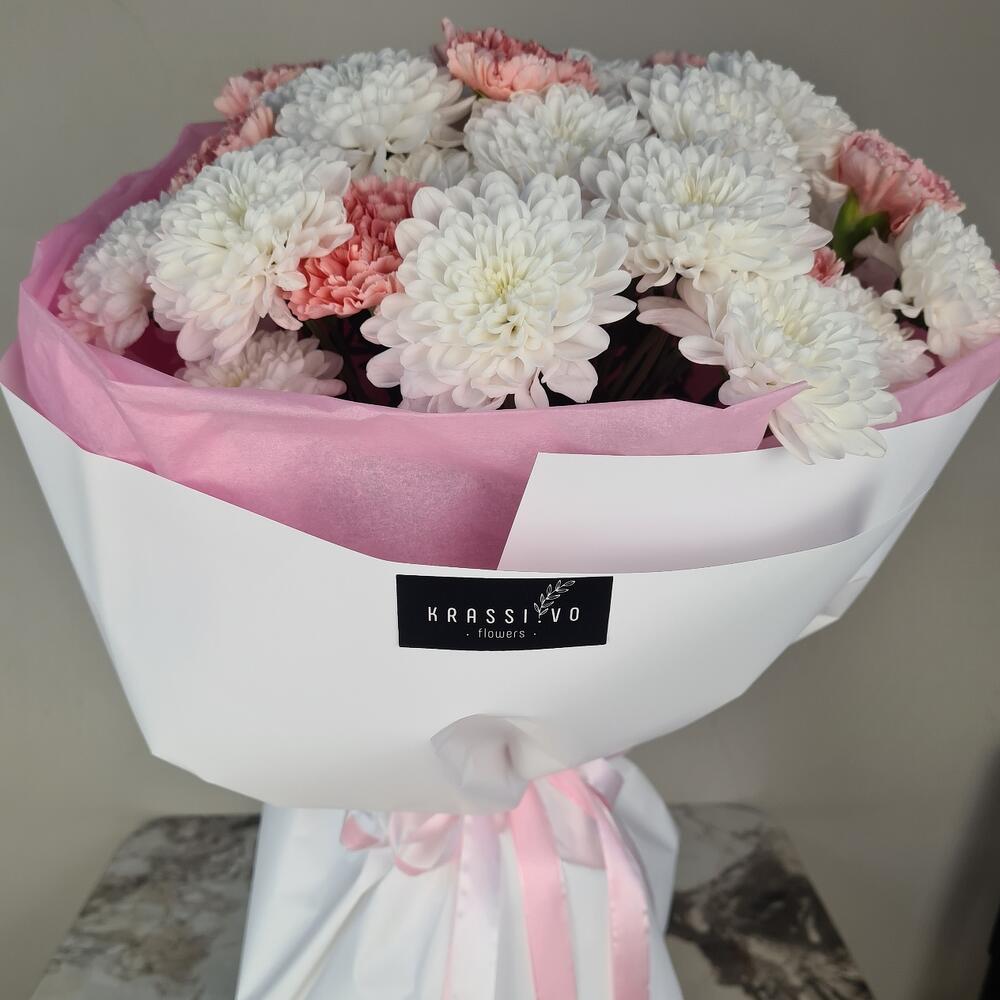 Chrysanthemum bush white - 4 pcs Dianthus pink - 8 pcs The film is white - 2 pcs quiet pink - 2 pcs