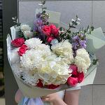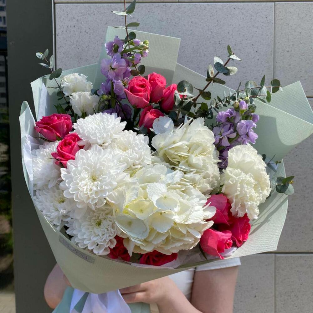 Hydrangea - 2 pcs Matthiola - 2 pcs Eucalyptus - 1 pcs Bush rose - 4 pcs Chrysanthemum - 1 pcs Eustoma - 2 pcs