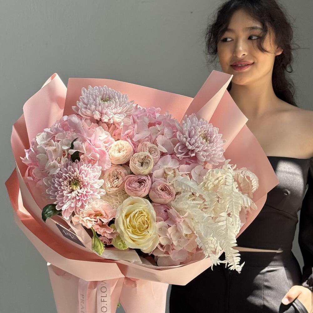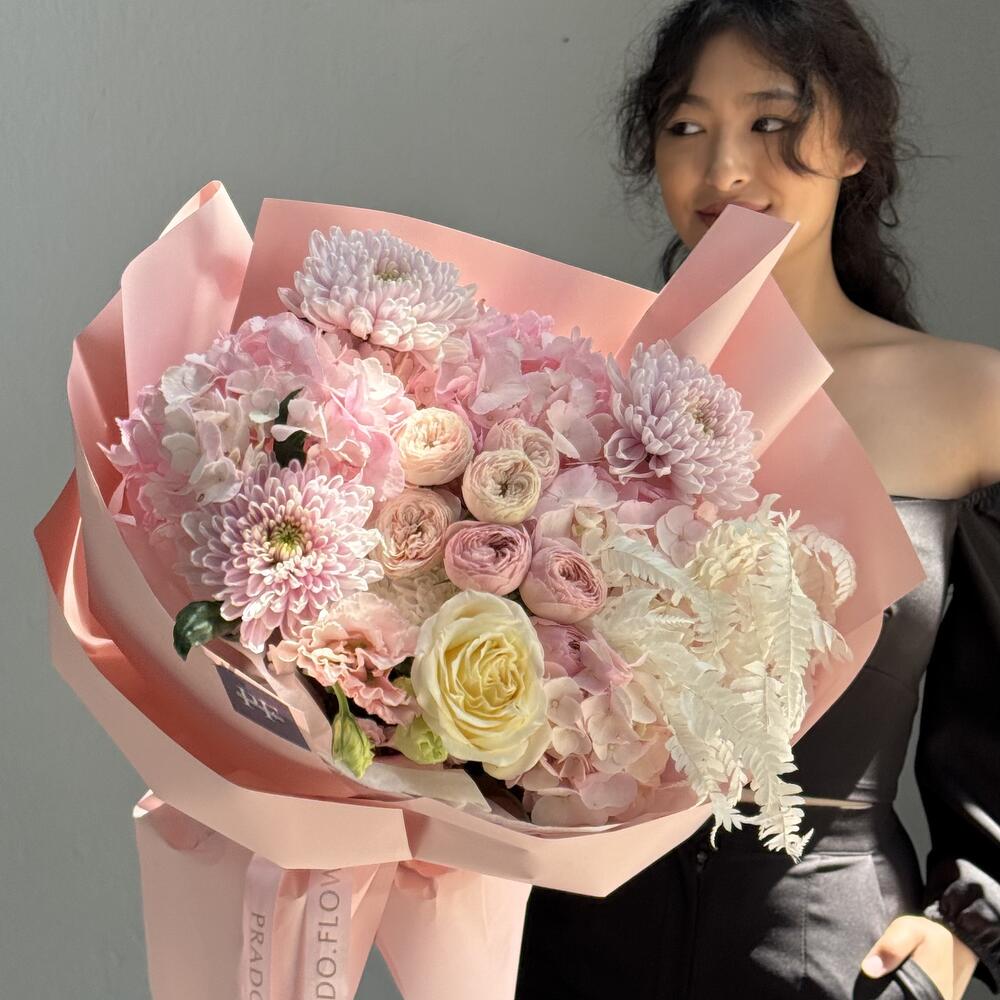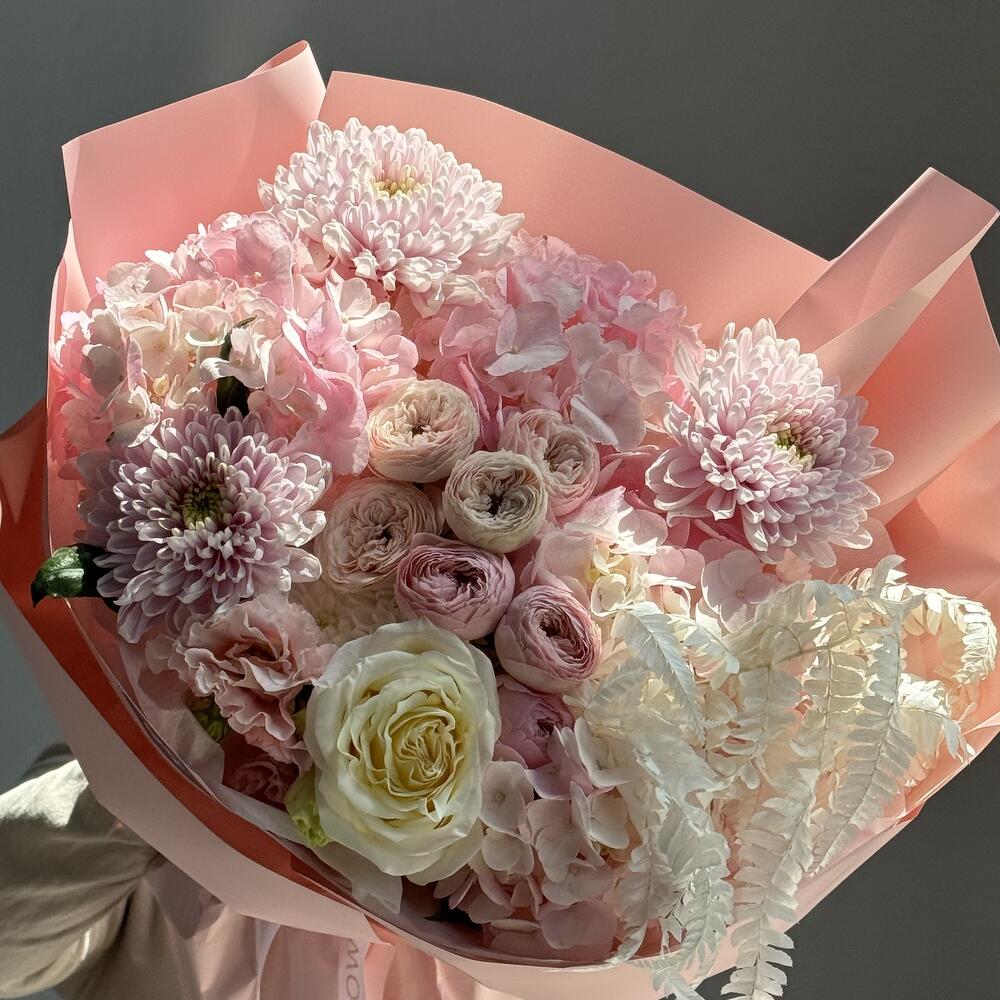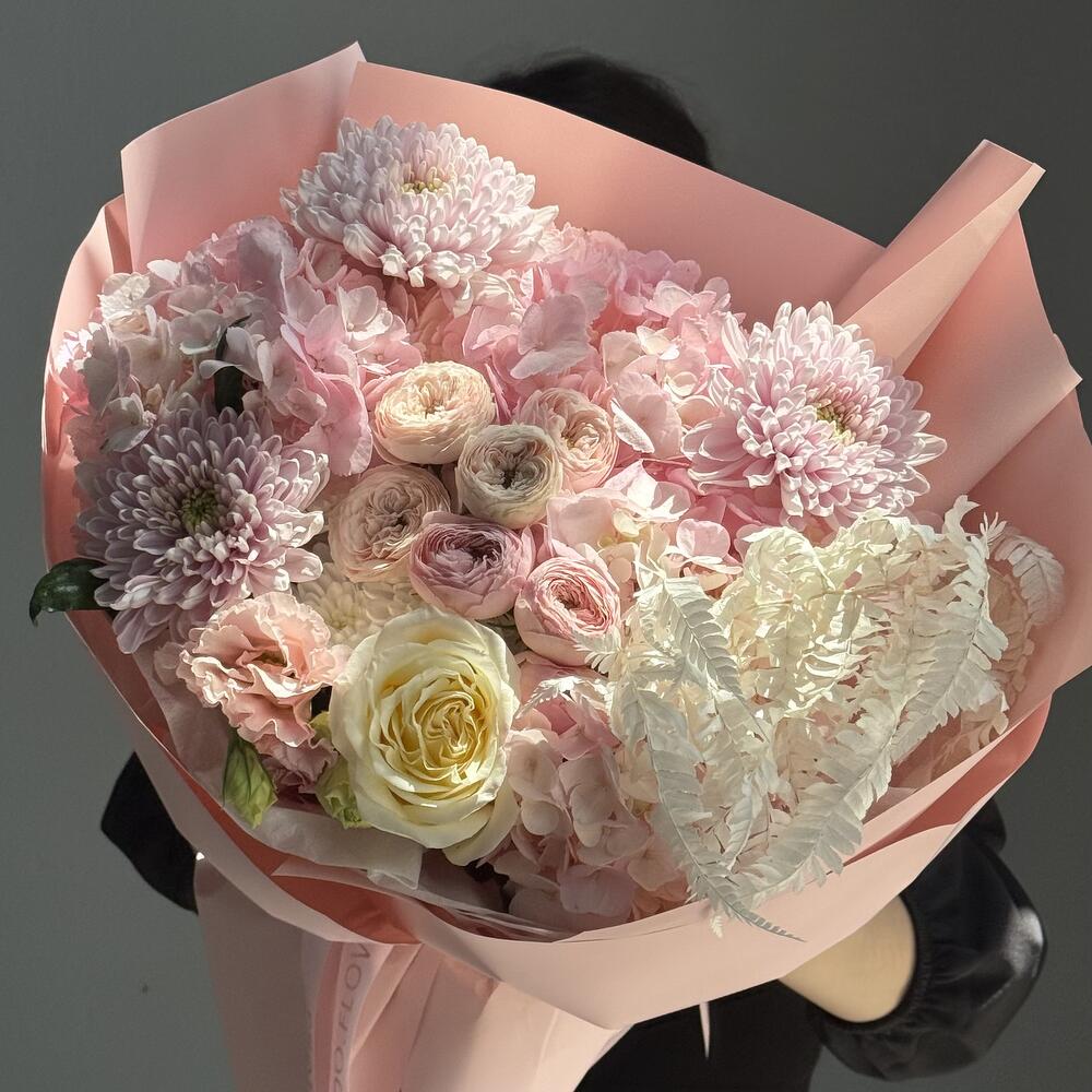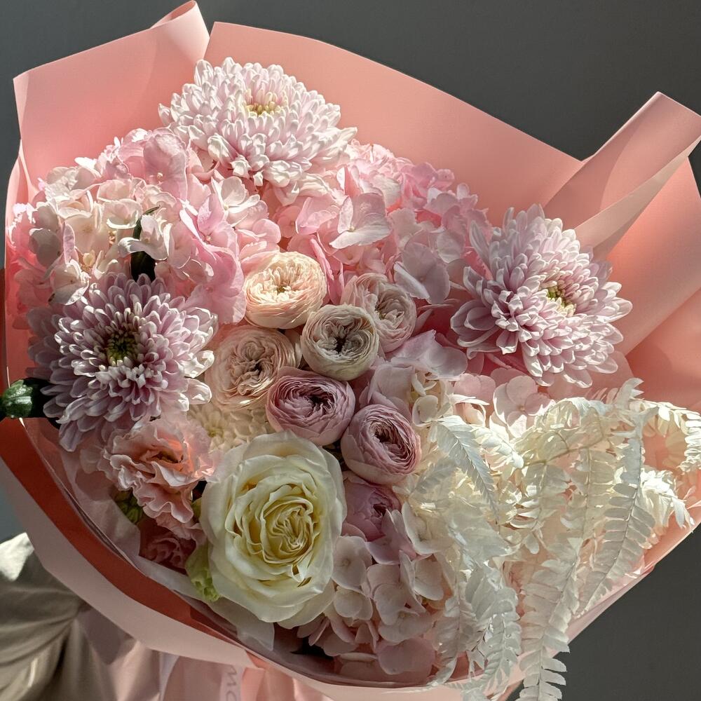 Hydrangea - 3 pcs Chrysanthemum bush - 2 pcs Eustoma - 2 pcs Dried flowers - 2 pcs Spray rose - 5 pcs mixed bouquet of flowers - 19 pcs roses - 3 pcs chrysanthemums disbudded - 3 pcs