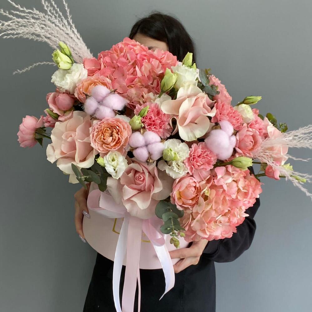 Hydrangea - 2 pcs Lisianthus - 4 pcs Cotton - 3 pcs Eucalyptus - 3 pcs Carnation - 5 pcs Dried flowers - 3 pcs Box - 1 pcs juliet bush rose peony - 4 pcs roses - 5 pcs